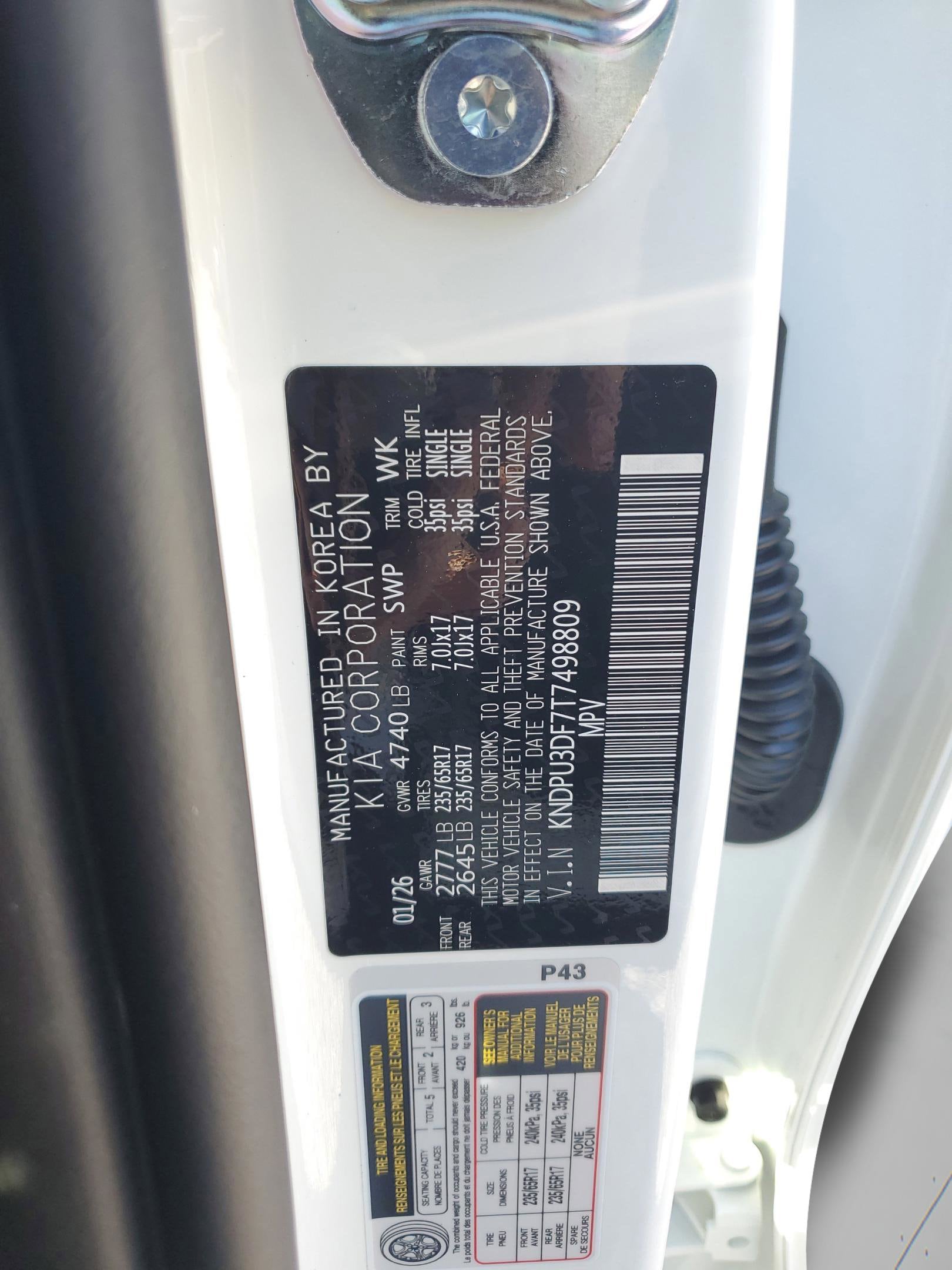 VIN: KNDPU3DF7T7498809