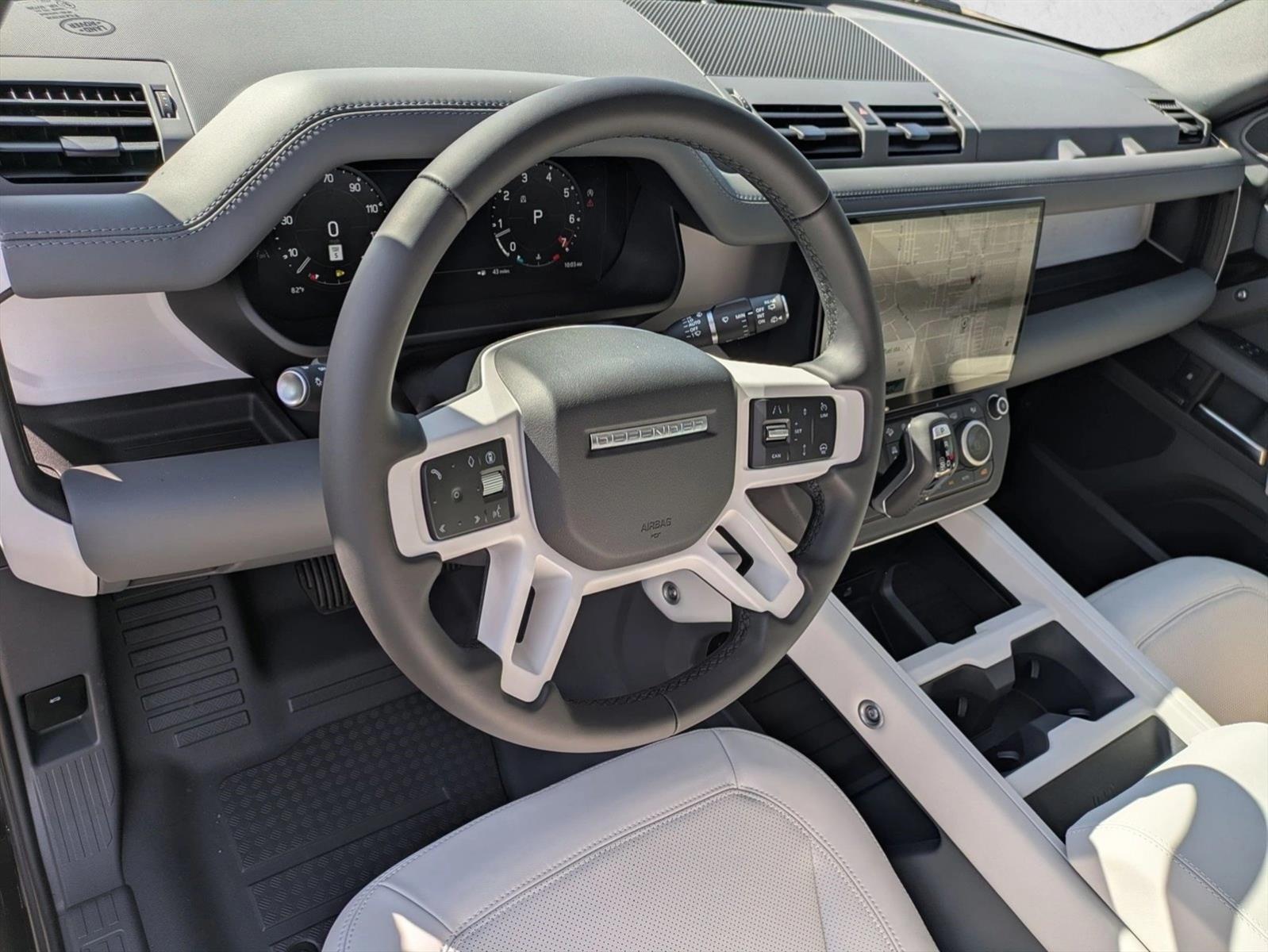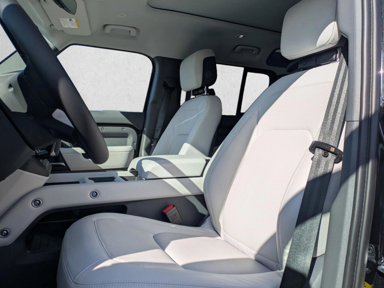 The 2026 Land Rover Defender 110 P400 X-Dynamic SE is a sport utility vehicle with a 3.0L I-6 mild hybrid engine and all-wheel drive. It features a luxurious interior with perforated Windsor Leather seat trim, premium upgrade interior pack, and extended leather upgrade. The exterior is Santorini Black Metallic with a body-colored roof and extended black exterior pack. This new Defender offers a blend of rugged capability and luxurious comfort, making it ideal for both family driving and off-road adventures.