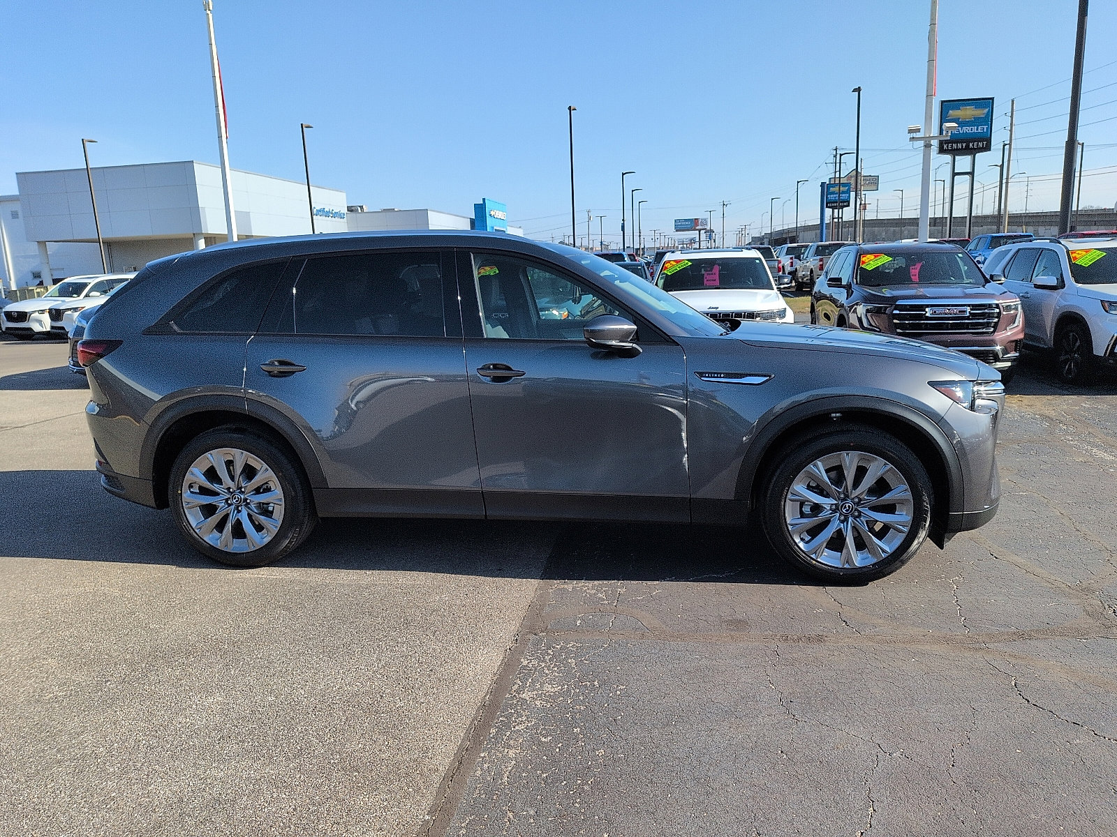 Boasts 28 Highway MPG and 23 City MPG! This Mazda CX-90 boasts an Intercooled Turbo Gas/Electric I-6 3.3 L/200 engine powering this automatic transmission. Roadside assistance kit, premier carpet set - bench seat including Carpeted Cargo Mat (CMS), Premium Carpet Floor Mats (PFA), Machine Gray Metallic paint charge. This Mazda CX-90 comes equipped with these options. Stop by today. Come in for a quick visit at Lou Fusz Evansville Volvo and Mazda, 4500 E Division St, Evansville, IN 47715 to claim your Mazda CX-90!