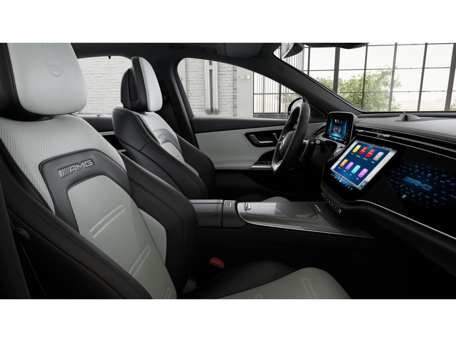 The 2026 Mercedes-Benz AMG E 53 E 4MATIC+ Sedan features a P2 Hybrid System with an AMG 3.0L I6 Turbo engine and a permanently excited synchronous electric motor. With a luxurious interior and advanced technology, this vehicle offers a blend of performance and comfort. The exterior is designed in Graphite Grey Metallic, complemented by a two-tone neva grey and black AMG nappa leather interior. Safety and convenience are prioritized with features like the Adaptive Cruise Control, Blind Spot Monitor, and a panoramic sunroof.