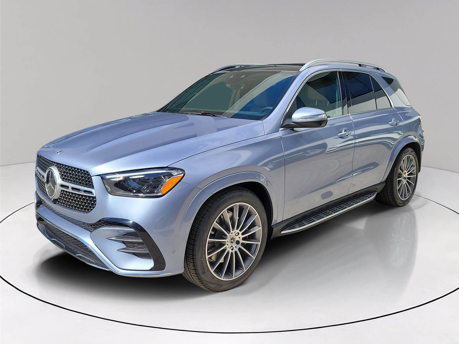 Light Blue 2026 Mercedes-Benz GLE GLE 580 4MATIC® 4D Sport Utility 4MATIC® 9-Speed Automatic 4.0L V8. Burmester is a registered trademark of Burmester Audiosysteme GmbH, Berlin, Germany. Bluetooth is a registered trademark of Bluetooth SIG, Inc. Harman/kardon and Logic 7 are registered trademarks of Harman International Industries, Incorporated. This vehicle's options include 13 speakers, 20 AMG Twin 5-Spoke Wheels, adaptive suspension, Apple CarPlay/Android Auto, navigation system, premium audio system, rain sensing wipers, SiriusXM Satellite Radio, sunroof/moonroof, wireless charging, and wireless smartphone integration.