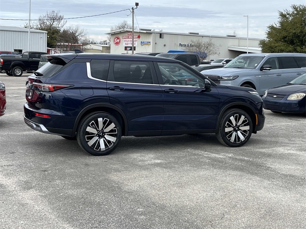 Blue 2026 Mitsubishi Outlander SE FWD CVT 1.5L I4 Turbocharged DOHC 16V LEV3-SULEV30 174hp 3rd row seats: split-bench, 4-Wheel Disc Brakes, 8 Speakers, ABS brakes, Air Conditioning, Alloy wheels, AM/FM radio: SiriusXM, Android Auto & Apple CarPlay, Auto High-beam Headlights, Auto-dimming Rear-View mirror, Automatic temperature control, Brake assist, Bumpers: body-color, Driver door bin, Driver vanity mirror, Dual front impact airbags, Dual front side impact airbags, Electronic Stability Control, Emergency communication system: Mitsubishi Connect w/ 24-month trial, Exterior Parking Camera Rear, Four wheel independent suspension, Front anti-roll bar, Front Bucket Seats, Front Center Armrest w/Storage, Front dual zone A/C, Front fog lights, Front reading lights, Fully automatic headlights, Garage door transmitter: HomeLink, Heated door mirrors, Heated Front Bucket Seats, Heated front seats, Illuminated entry, Knee airbag, Leather Shift Knob, Leather steering wheel, Low tire pressure warning, Navigation System, Occupant sensing airbag, Outside temperature display, Overhead airbag, Overhead console, Panic alarm, Passenger door bin, Passenger vanity mirror, Power door mirrors, Power driver seat, Power Liftgate, Power steering, Power windows, Radio data system, Radio: AM/FM 12.3" Navigation w/Smartphone-Link, Rain sensing wipers, Rear anti-roll bar, Rear seat center armrest, Rear side impact airbag, Rear window defroster, Rear window wiper, Reclining 3rd row seat, Remote keyless entry, Security system, Speed control, Speed-Sensitive Wipers, Split folding rear seat, Spoiler, Steering wheel mounted audio controls, Synthetic Leather Seating Surfaces, Tachometer, Telescoping steering wheel, Tilt steering wheel, Traction control, Trip computer, Turn signal indicator mirrors, Variably intermittent wipers, Wheels: 20" Two-Tone Alloy.