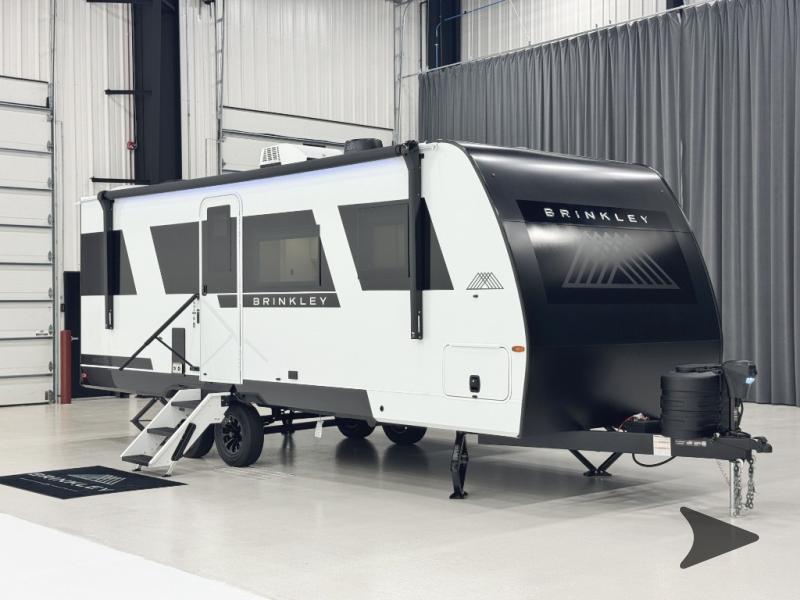 Brinkley Model Ix travel trailer 23x highlights: Front Semi-Private Bedroom. This is the perfect travel trailer for the couple looking for comfort at the campground! Once you've unloaded the pass-thru storage, you can put out the 17' patio awning and relax in your camp chairs. Head inside to make lunch in the fully equipped kitchen that includes a three-burner range, 30" convection microwave, and dishwasher prep. There is a pantry with outlets within the large slide out, along with a 10-cu. ft. refrigerator that you can access with the slide in, plus theater seating across from the TV. And if you need sleeping space for guests, just choose the optional tri-fold sofa in place of the theater seating! A pull-out table with a drawer provides a place to dine together, and the entryway closet will be perfect to keep jackets and shoes tidy. You'll get a great night's rest on the front queen bed with four drawers, nightstand cubbies, and a room divider for a little more privacy. The Model Ix by Brinkley is your ticket to lightweight towing and exceptional features. This premium half-ton towable travel trailer features Brinkley's CraftSense building materials for a higher level of construction, along with a seamless laminated aluminum exterior with automotive grade full-body paint and modern graphics. You will stay powered up thanks to the power package with a 200-watt solar panel, and the Road Armor suspension will help provide a smooth tow from home to campground. The interior of the Model Ix includes premium residential cabinets with dovetail drawers, an ultra quiet and efficient A/C system, and a SoundCore Boom 2 Bluetooth waterproof speaker so you can listen to your favorite tunes indoors or outdoors!