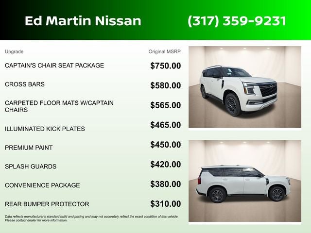 2026 Nissan Armada SL 4WD. Well Equipped with: Captain's Chair Seat Package (2nd Row Center Console with Two Cupholders, 2nd Row Outboard Captain's Chairs with Armrests, and EZ Flex Second Row Seating System with One Touch Release), Convenience Package, 4WD, 12 Speakers, 3rd row seats: split-bench, 4-Wheel Disc Brakes, ABS brakes, Air Conditioning, Alloy wheels, AM/FM radio: SiriusXM w/360L, Anti-whiplash front head restraints, Apple CarPlay/Android Auto, Auto High-beam Headlights, Auto tilt-away steering wheel, Auto-dimming door mirrors, Auto-dimming Rear-View mirror, Auto-leveling suspension, Automatic temperature control, Brake assist, Bumpers: body-color, Carpeted Floor Mats with Captain Chairs, Center Front Spoiler, Compass, Cross Bars, Delay-off headlights, Driver door bin, Driver vanity mirror, Dual front impact airbags, Dual front side impact airbags, Electronic Stability Control, Emergency communication system: NissanConnect Services, Four wheel independent suspension, Front anti-roll bar, Front Bucket Seats, Front Center Armrest, Front dual zone A/C, Front reading lights, Fully automatic headlights, Garage door transmitter: myQ Connected Garage, Genuine wood dashboard insert, Heated door mirrors, Heated Front Bucket Seats, Heated front seats, Heated steering wheel, HVAC memory, Illuminated entry, Illuminated Ignition Switch and Panic Button, Knee airbag, Leather steering wheel, Low tire pressure warning, Memory seat, Navigation system: Google Maps, Occupant sensing airbag, Outside temperature display, Overhead airbag, Overhead console, Panic alarm, Passenger door bin, Passenger vanity mirror, Power door mirrors, Power driver seat, Power Liftgate, Power passenger seat, Power steering, Power windows, Premium Paint, Radio: NissanConnect with SiriusXM 360L, Rain sensing wipers, Rear air conditioning, Rear anti-roll bar, Rear Bumper Protector, Rear reading lights, Rear seat center armrest, Rear window defroster, Rear window wiper, Reclining 3rd row seat, Remote keyless entry and Security system. ED MARTIN AUTOMOTIVE GROUP has provided positive car buying experiences in Indianapolis, Plainfield, Avon, Brownsburg, Greenfield, Greenwood, Danville, Bloomington, Terre Haute, Columbus, Fishers, Carmel, Zionsville, Richmond, Lebanon and all of Marion county. We have two Nissan location here in central Indiana to serve your needs.