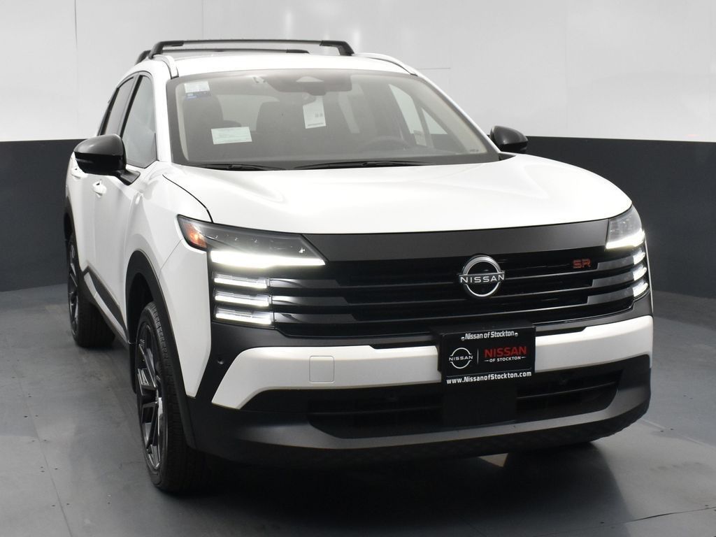 2026 Nissan Kicks SR FWD SUV Aspen White Tri over Sport interior. 31 MPG combined from a 2.0L I4 with Xtronic CVTagile, citysmart crossover. Entertainment: 12.3" NissanConnect touchscreen, wireless Apple CarPlay/Android Auto, WiFi hotspot, SiriusXM, Bluetooth, handsfree text, myQ; SR Premium Package adds Bose Personal Plus audio. Safety: Safety Shield 360 ADAS Automatic Emergency Braking with Pedestrian Detection, Rear Automatic Braking, Blind Spot Warning & Intervention, Rear CrossTraffic Alert, Lane Departure Warning & Intervention, High Beam Assist, ProPILOT Assist, HD Intelligent Around View Monitor (360), front/rear sonar. Interior/Exterior & Packages: Sport leatherette, 60/40 split seat, Remote Engine Start, Intelligent Key; LED low/highbeam headlights, roof rails, rear spoiler, 19" alloys. Cold Weather (heated seats/mirrors, rear ducts), Interior Electronics (ambient lighting, autodimming HomeLink mirror, wireless charger), Illumination, Exterior Finishers, Center Armrest, Underfloor Protector, Dash Cam, Splash Guards, Carpeted Mats.
