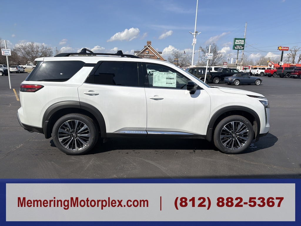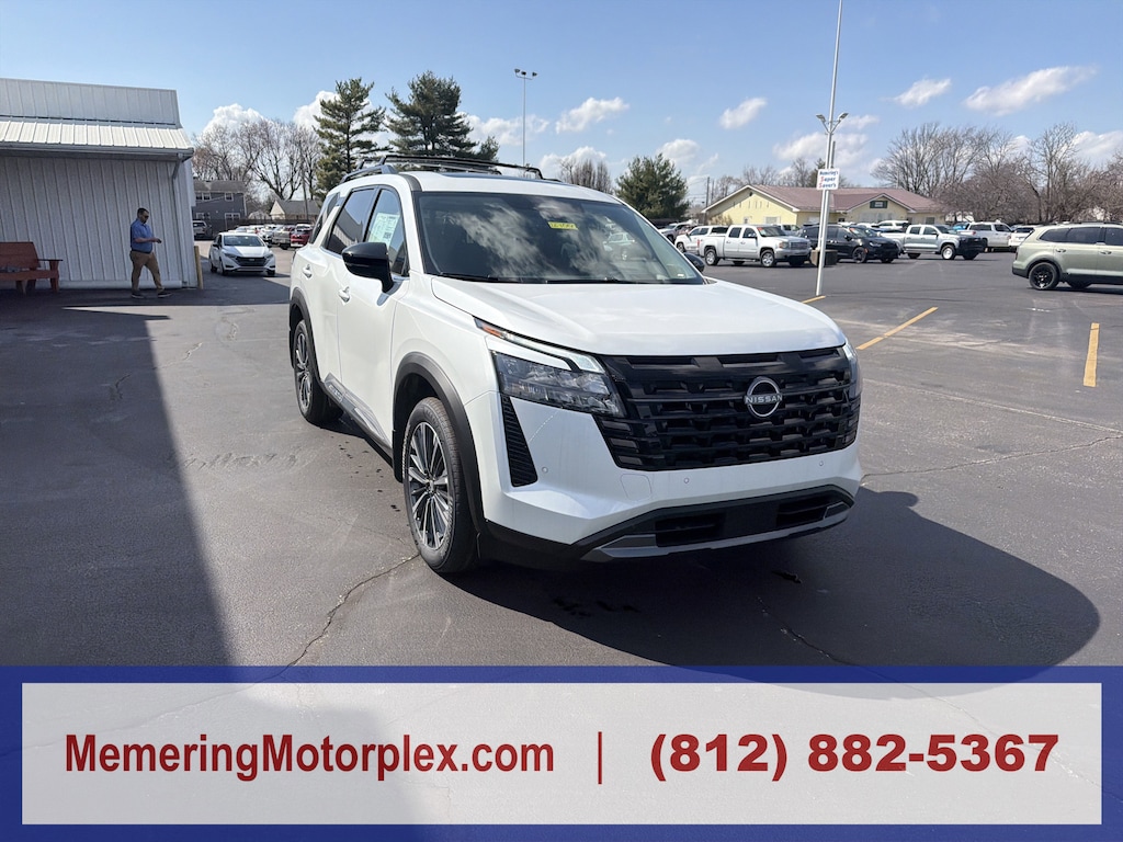 Everest White Pearl Tricoat, Chestnut, semi-aniline leather-appointed seating surfaces -inc: quilting, cargo package -inc: dividers and console net, cargo area protector, cargo net, first aid, bench seat carpeted floor mats, cross bars, 4-piece black splash guards, premium paint, bench seat carpeted floor mats. This Nissan Pathfinder has a strong Regular Unleaded V-6 3.5 L/213 engine powering this automatic transmission. For a must-own Nissan Pathfinder come see us at Memering Motorplex, 1949 Hart St, Vincennes, IN 47591. Just minutes away! Memering Motorplex is dedicated to your satisfaction before, during, and after your purchase. We'll go the extra mile to take care of you.