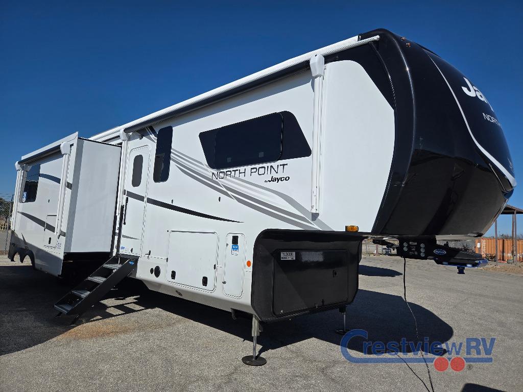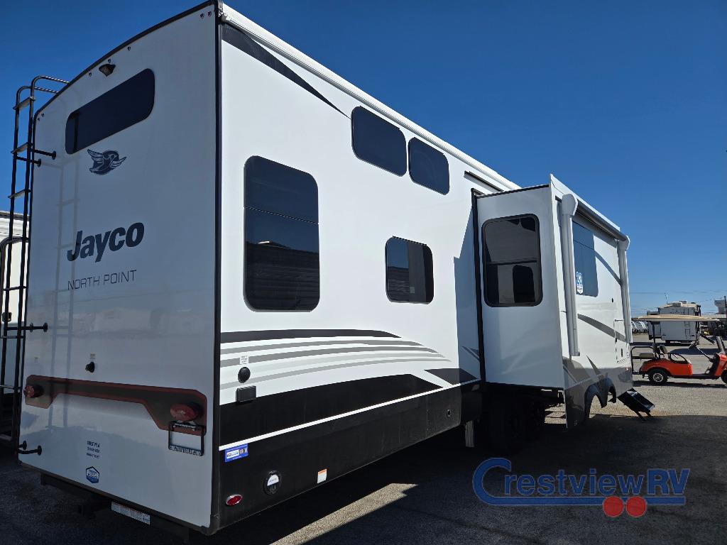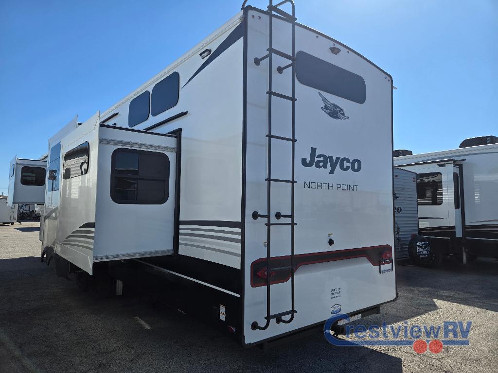 Jayco North Point fifth wheel 395DSDB highlights: Two Bedrooms, Two Bathrooms, Loft, Two Awnings, Residential GE Refrigerator. With two bedrooms plus a loft, there aren't many fifth wheels that can sleep as many people in as much comfort as this Jayco North Point! Up front is a private bedroom suite with a king bed and next to the bedroom is a full bathroom, while towards the rear you'll find a second bedroom with a queen bed. This bedroom also has an adjacent bathroom, conveniently all the way to the rear so it has its own entry door to the outside. There's also a loft with two bed mats which will be perfect for kids. In the center of it all you'll find a great living space, with a fully equipped kitchen and plenty of room for everyone to hang out. Relax in the L-shaped sofa across from the fireplace for cozy evenings. With any North Point fifth wheel by Jayco you begin with a strong foundation with a custom frame, designed and sized specifically to best support each unit. Constructed with Stronghold VBL aluminum framed, vacuum bond laminated walls and the Magnum Truss XL6 roof system with an Alpha roof membrane system, which is the strongest tested roof in the industry. The 5-Star Handling package is included with H-rated tires with TPMS, a MORryde rubber pin box, Dexter axles with Nev-R-Adjust brakes, MORryde CRE-3000 rubberized suspension and wet bolt fasteners and bronze bushings. The interior has handcrafted hardwood glazed doors and drawers, vinyl flooring throughout, an integrated under-mount sink in the main bathroom, plus so much more you just have to see one to believe it all!