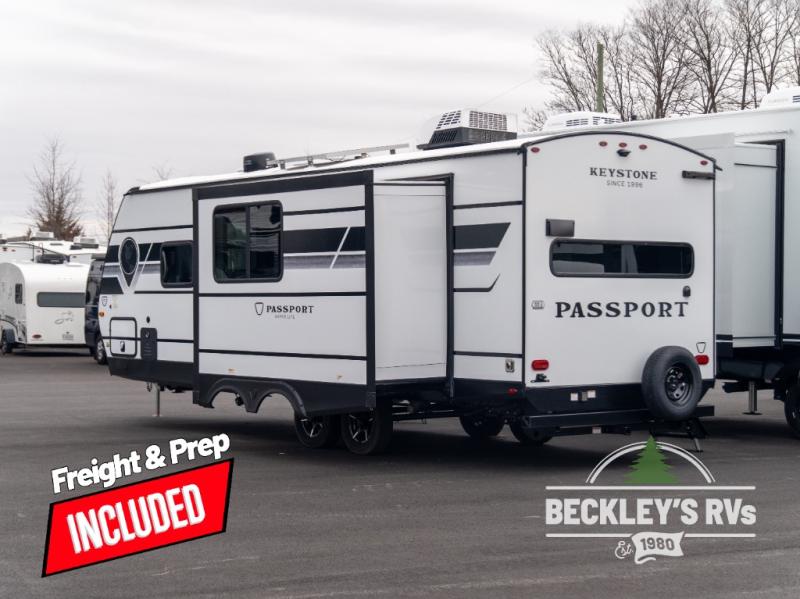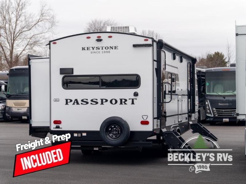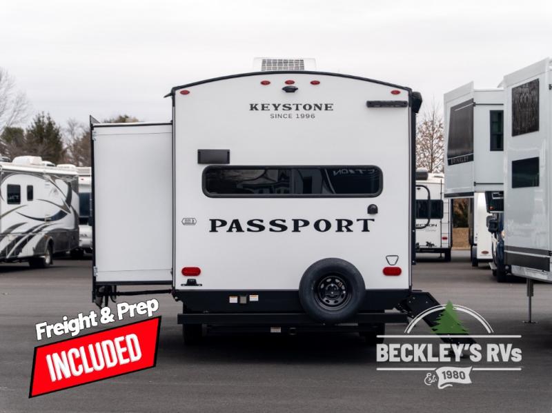 Keystone Passport Super Lite travel trailer 2450RKWE highlights: Rear Kitchen, Do-More Booth Dinette, Dual Entry Doors, Pass-Thru Storage. Are you looking to upgrade from a tent to a travel trailer? This dual axle unit may be the one! Since there are dual entry doors, you can enter in through the front master bedroom with a queen bed or the rear kitchen with ample counter space. Your crew can relax on the tri-fold sofa, play a game at the do-more dinette, or visit outdoors under the 19' awning. There is also an outdoor kitchen here for a sunrise breakfast! The walk-thru bath is easily accessible for everyone to use, and you'll find plenty of storage space throughout, including a large pantry, overhead compartments, and dual bedroom wardrobes. With any Keystone Passport Super Lite travel trailer you will enjoy lightweight towing and lots of interior comforts! The power tongue jack lets you hitch up at the drop of a hat, and the Dexter torsion axle rubber ride suspension will make towing easier than ever. You will appreciate having power stabilizer jacks for quick setup and an exterior convenience center to monitor tank levels. These trailers are constructed with a seamless, laminated and gel-coated filon exterior, 80% tinted safety glass windows, and a one-piece polypropylene underbelly. The interior will have you feeling right at home with residential durable Beauflor vinyl flooring, deluxe night shades, LED lighting throughout, and seamless kitchen countertops to name a few comforts.