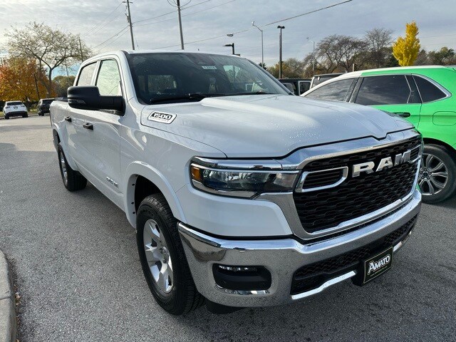 The 2026 Ram 1500 Big Horn Crew Cab 4x4 5'7" Box in Bright White Clearcoat delivers rugged capability with refined style. Its exterior features chrome front and rear bumpers with black accents, body-colored fender flares and door handles, black side mirrors with power and heating functionality, deep-tinted glass, 18-inch cast-aluminum wheels with all-season tires, and a functional tailgate with rear cargo access. Advanced lighting includes automatic high-beam LED headlights, front fog lamps, and perimeter/approach lights, while the MOPAR deployable bed step, rear power sliding window, and bed utility group enhance utility. Powered by a 3.0L I6 Hurricane SO Twin Turbo ESS engine paired with an 8-speed automatic transmission, this Ram 1500 provides smooth power delivery, combined with part-time 4WD, electronic transfer case, auto locking hubs, and a 3.92 rear axle ratio. The suspension features short and long arm front coils, solid rear axle with coil springs, HD gas-pressurized shocks, and front/rear anti-roll bars for confident handling on- or off-road. With a 7,100-lb GVWR, Class IV towing equipment, trailer sway control, and a 26-gallon fuel tank, its ready for heavy-duty work or weekend adventures. Inside, the cabin balances comfort and convenience with deluxe cloth bucket seats, heated front seats, 60/40 folding rear bench, full-length center console, and leather-wrapped steering wheel. Technology includes Uconnect 5 with 8.4-inch touchscreen, Apple CarPlay, Android Auto, SiriusXM, GPS navigation, multiple USB/12V outlets, 4G LTE Wi-Fi hotspot, and integrated voice command. Additional features include heated steering wheel, power-adjustable pedals, active noise control, and overhead LED lighting. Safety and driver assistance are comprehensive, featuring forward collision warning-plus, blind-spot detection, park assist front and rear, multiple airbags including curtain and seat-mounted side airbags, cross-path detection, tire pressure monitoring, and rear child safety locks. The 2026 Ram 1500 Big Horn Crew Cab 4x4 5'7" Box is a durable, tech-packed pickup designed to handle work.