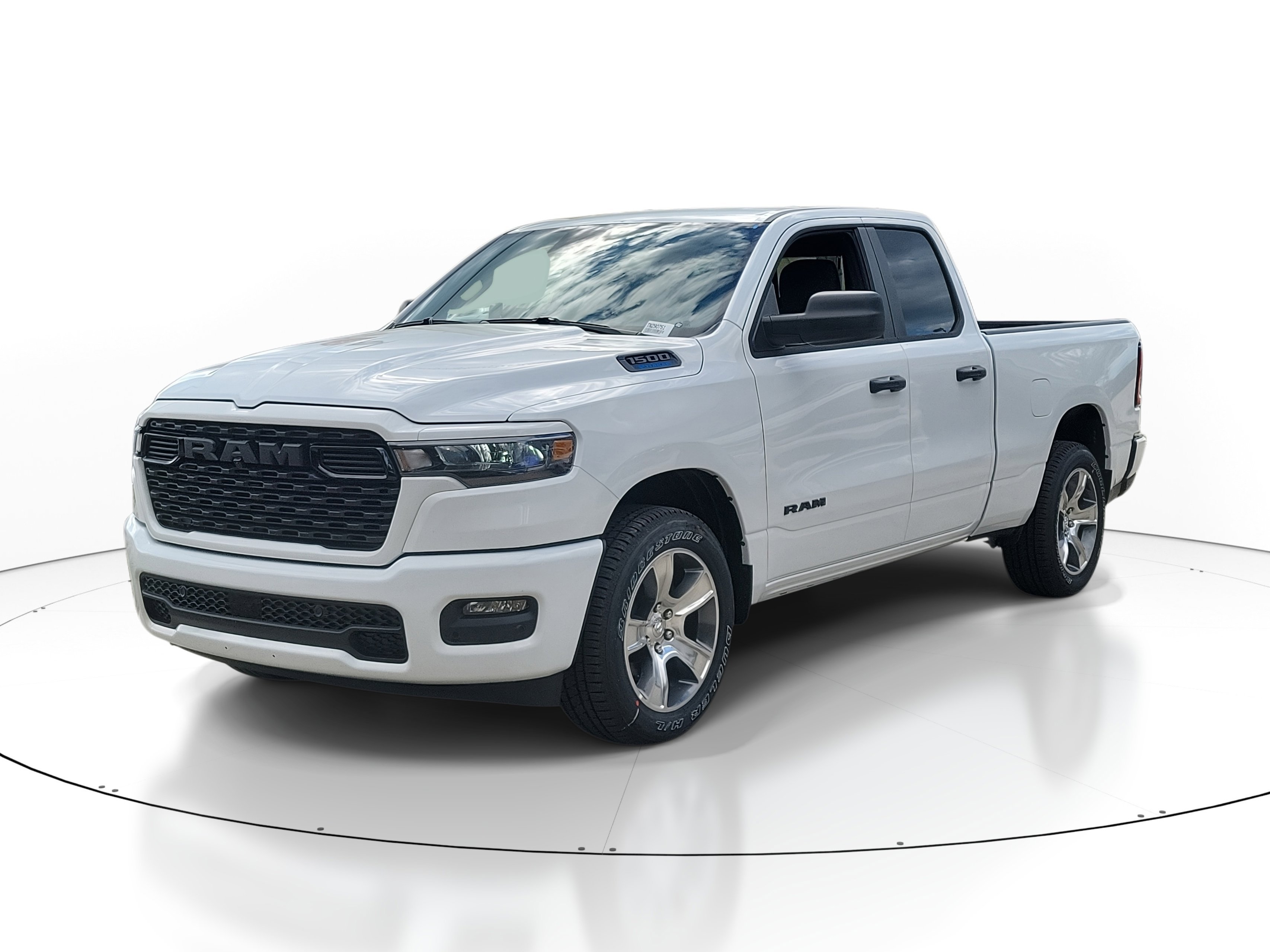 The 2026 Ram 1500 Express Quad Cab 4x2 features a Bright White Clearcoat exterior and a Black interior. This large pickup is powered by a 3.6L V6 gas/electric hybrid engine paired with an 8-speed automatic transmission. The vehicle offers a comfortable ride, advanced safety features, and modern connectivity, making it a versatile choice for both work and leisure.