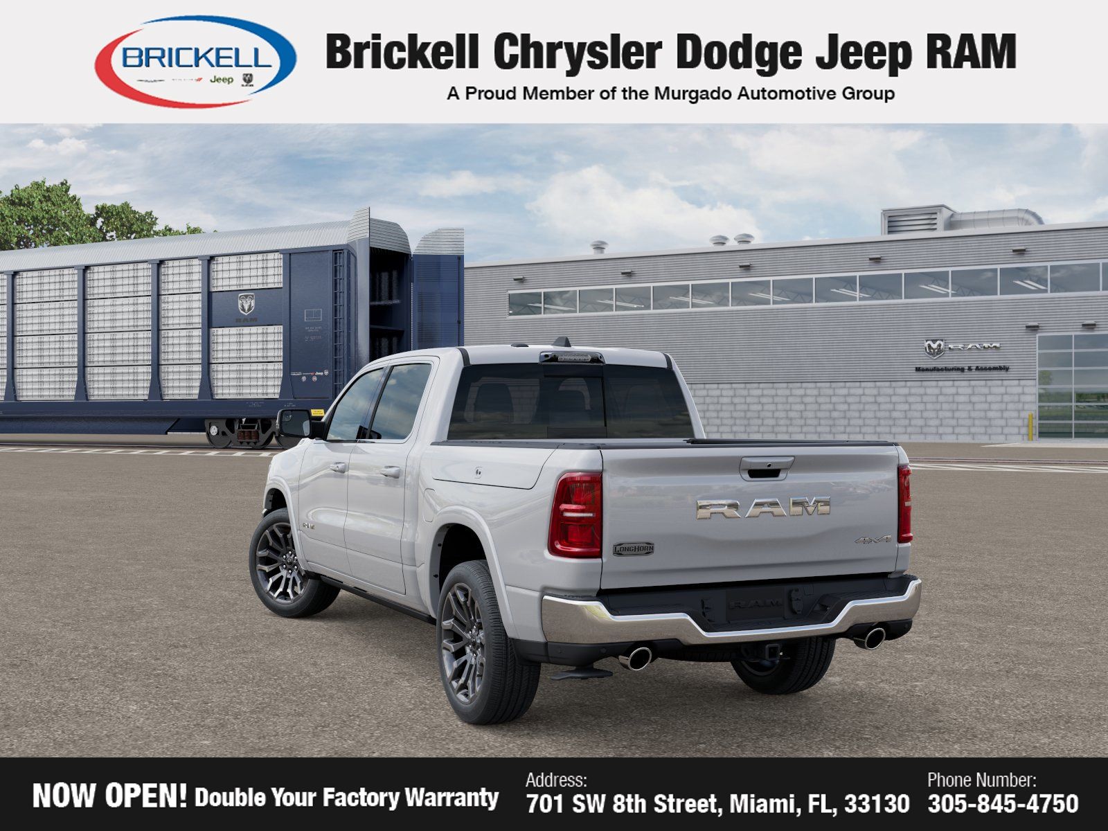 Discover Your Next Vehicle at Brickell Chrysler Dodge Jeep Ram. Welcome to Brickell CDJR, where we go beyond selling cars. We double the factory powertrain warranty, giving you added peace of mind. Our dealership offers one of the largest new car inventories in the region, ensuring you find the right vehicle. Prices displayed do not include our Perma-plate. Our state-of-the-art service department is the largest in the country and is open seven days a week from 7 AM to 9 PM. Visit us at 701 SW 8th St, Miami, FL 33130, or call 305-777-2800 to learn more and schedule a test drive. The displayed price includes an incentive for financing with Brickell CDJR Finance Company. Outside financing and bank drafts are not accepted. All pre-owned vehicle exports are subject to an export fee. Prices apply only to customers who live, work, or worship in Broward, Miami-Dade, Palm Beach, Monroe, Collier, Hendry, Lee, Glades, Martin, St. Lucie, Okeechobee, Manatee, Hillsborough, Osceola, or Orange County. Customers outside these counties will pay an additional $ Taxes, title, registration, and dealer fees apply.