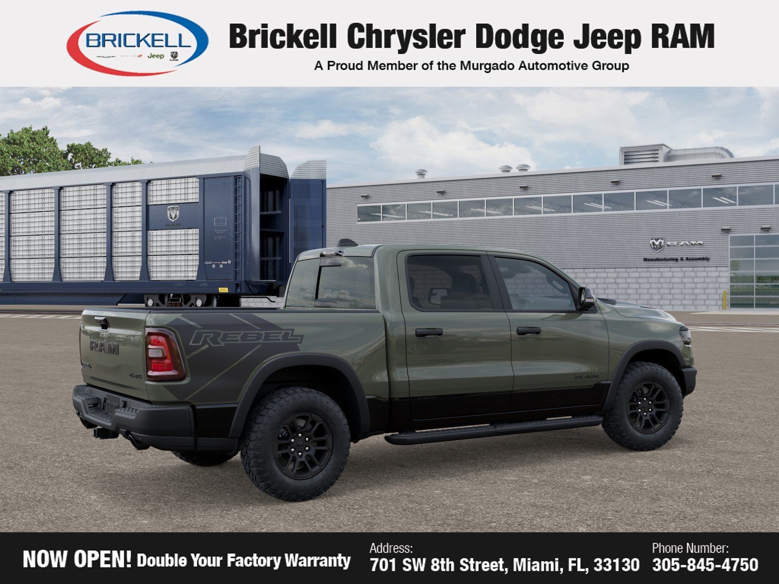 Discover Your Next Vehicle at Brickell Chrysler Dodge Jeep Ram. Welcome to Brickell CDJR, where we go beyond selling cars. We double the factory powertrain warranty, giving you added peace of mind. Our dealership offers one of the largest new car inventories in the region, ensuring you find the right vehicle. Prices displayed do not include our Perma-plate. Our state-of-the-art service department is the largest in the country and is open seven days a week from 7 AM to 9 PM. Visit us at 701 SW 8th St, Miami, FL 33130, or call 305-777-2800 to learn more and schedule a test drive. The displayed price includes an incentive for financing with Brickell CDJR Finance Company. Outside financing and bank drafts are not accepted. All pre-owned vehicle exports are subject to an export fee. Prices apply only to customers who live, work, or worship in Broward, Miami-Dade, Palm Beach, Monroe, Collier, Hendry, Lee, Glades, Martin, St. Lucie, Okeechobee, Manatee, Hillsborough, Osceola, or Orange County. Customers outside these counties will pay an additional $ Taxes, title, registration, and dealer fees apply.