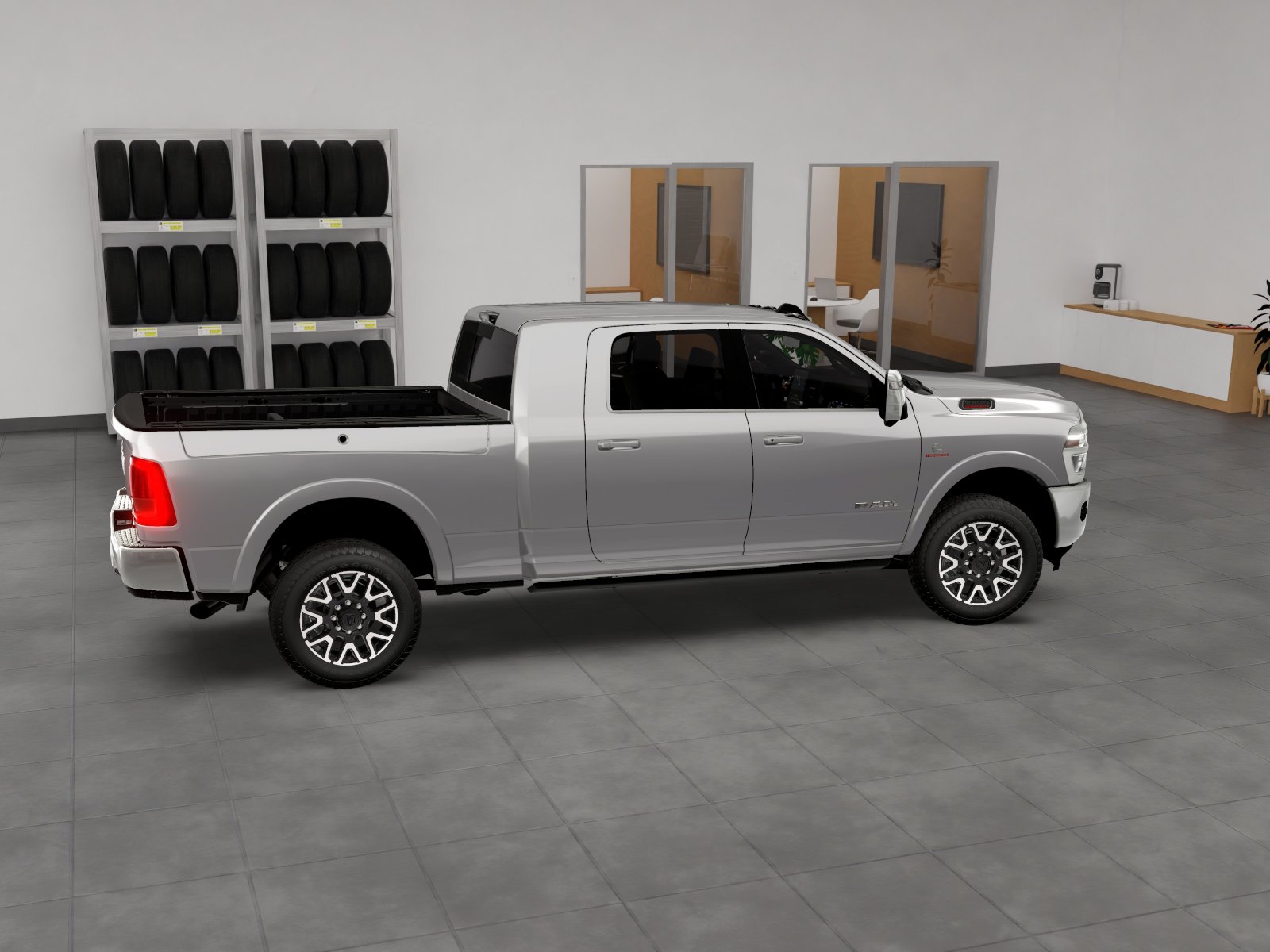 The 2026 Ram 2500 Limited Longhorn Mega Cab 4x4 features a 6.7L I6 Cummins HO Turbo Diesel engine and a 8-speed automatic transmission. This large pickup offers a premium driving experience with features like adaptive cruise control, Apple CarPlay, navigation system, and a full-size spare tire. The Silver-Zynith exterior is complemented by a Bison Brown interior, and the vehicle is equipped with advanced safety and technology features for comfort and capability.