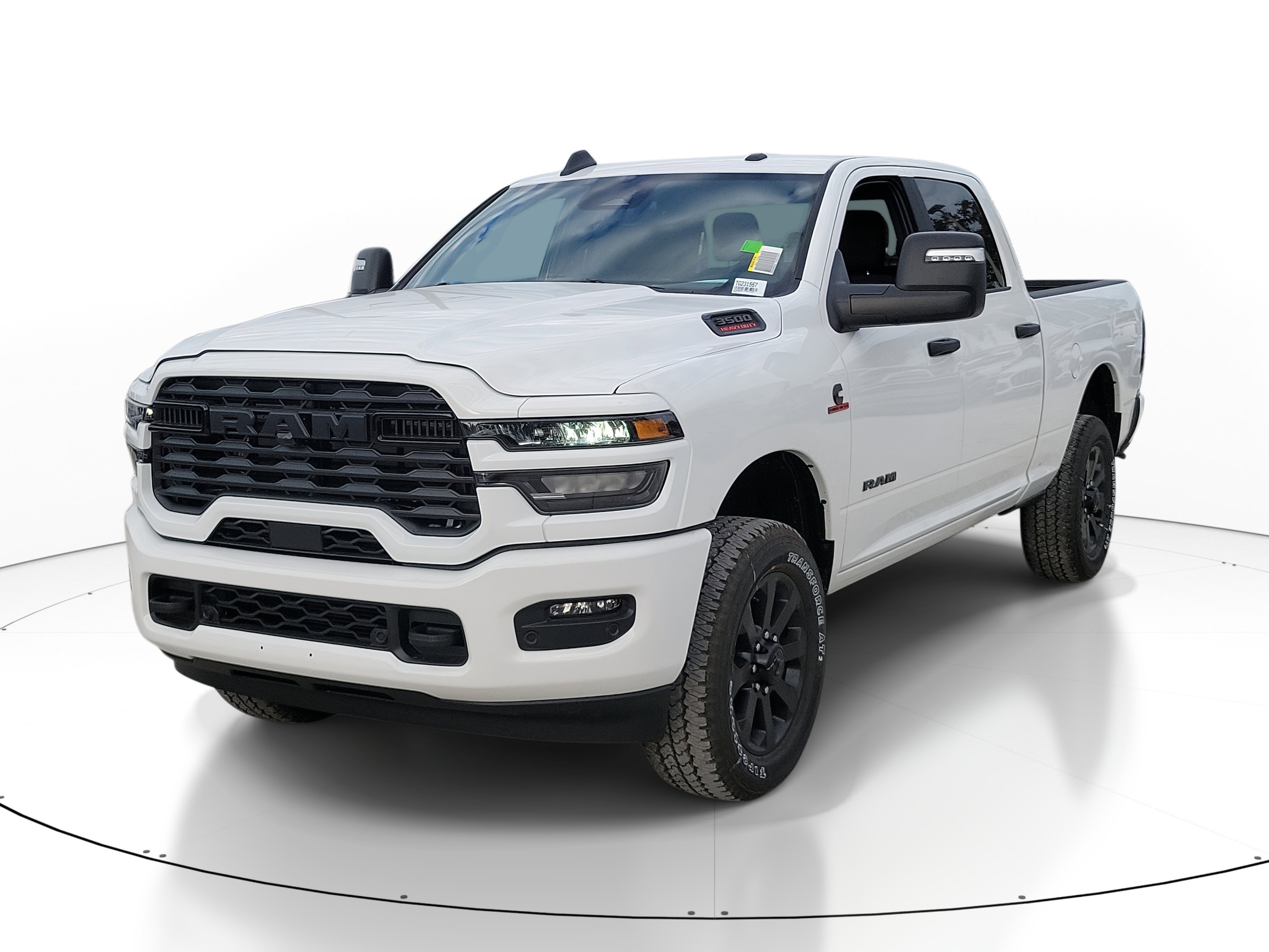 The 2026 Ram 3500 Big Horn Crew Cab 4x4 features a Bright White Clear-Coat Exterior Paint and Bright Bright White Clear-Coat exterior. The vehicle is powered by a 6.7L I6 Cummins HO Turbo Diesel engine with 430HP, and features a full-size spare tire, LED headlights, and a premium cloth bucket seat interior. This new Ram 3500 offers advanced safety features, connectivity, and a comfortable ride for up to 6 passengers.