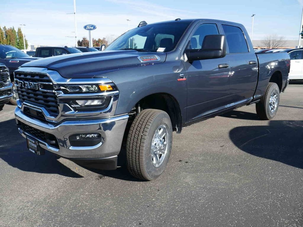 Our Diesel-powered 2026 Ram 3500 Tradesman Crew Cab 4x4 with the Chrome Appearance Package delivers what you demand in a truck backed by a bold Bright White design! Motivated by a TurboCharged 6.7 Liter High Output Cummins Diesel 6 Cylinder providing 420hp and 1075lb-ft of torque to an 8 Speed Automatic transmission for work-ready muscle. An anti-spin rear differential and HD shocks are standard for sure-footed performance when handling big loads, and this Four Wheel Drive truck blends that bold power with proud style. Our Ram 3500 is smartly equipped with the Chrome Appearance Pack's chrome bumpers, 18-inch steel chrome-clad wheels, spray-on Bedliner, deployable bed step, LED lighting, fog lamps, telescoping trailer mirrors, and a Class V hitch receiver. Our Tradesman cabin helps you thrive during long days with supportive work-grade seats, a tilt-adjustable steering wheel, air conditioning, cruise control, keyless access, pushbutton ignition, power accessories, and ample in-cab storage. You can also enjoy a full complement of infotainment features with an 8.4-inch touchscreen, 3.5-inch driver display, Apple CarPlay, Android Auto, WiFi compatibility, Bluetooth, and a six-speaker audio system. You can stay safe on the job or off with Ram intelligent driver-assistance systems. They protect you with automatic braking, adaptive cruise control, forward collision warning, a rearview camera, hill start assistance, tire pressure monitoring, and more. With all that, our Ram 3500 Tradesman puts premium productivity within easy reach! Save this Page and Call for Availability. We Know You Will Enjoy Your Peterson Autoplex Stampede Test Drive Towards Ownership!