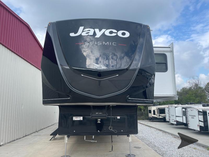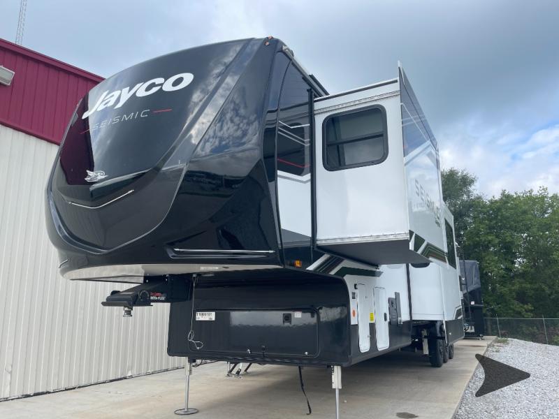 Jayco Seismic toy hauler 399 highlights: Party Deck, Queen Bed with Convertible Sofas, Overhead Garage Loft with Storage, Walk-in Shower, 60" x 80" Queen Bed, 4K Smart LED HDTV. Get ready for outdoor adventures in this spacious toy hauler. Your guests will have the 13' 6" garage with queen bed with convertible sofa and a loft for added sleeping space, plus there is overhead storage for your things and a side man door to come and go easily. The main living area includes dual opposing slides with an L-shaped tri-fold sofa along the roadside and your dinette and refrigerator plus pantry in the curbside slide. Head up the steps to your front private bedroom with the dual entry bath accessible from the hall and inside the master bedroom. Here you will all enjoy a walk-in shower, toilet, and vanity with a sink, plus overhead storage. The bedroom features a third slide out housing a queen bed for added floor space, plus a full front walk-in closet, a dresser, and washer/dryer prep! One look at the Seismic toy haulers by Jayco, and you'll never go back! Each model features a custom automotive-grade vinyl exterior graphics package, a painted fiberglass front cap with built-in LED lighting, and 102" wide-body structural steel I-beam construction. You'll find the pass-through storage with Slam-Latch baggage doors will make unpacking easier than ever, and the rear ramp door/patio with anti-slip, non-skid flooring will allow you to unload your toys with no trouble at all. These toy haulers feature a three seasons garage wall/doors, a 30 gallon fuel tank with a timer, and exterior marine-grade speakers to keep the party going. The Climate Shield zero degree tested weather protection includes a 35,000 BTU furnace, PEX plumbing, and a fully enclosed and heated underbelly so you can enjoy your adventures year around. And we haven't even touched on the interior luxuries you'll find, like solid hardwood cabinet doors, residential vinyl flooring made in the USA, night shades, and more!