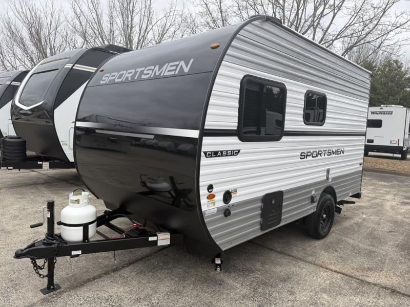 KZ Sportsmen Classic travel trailer 130RD highlights: 54" x 80" Bed, Two Burner Cooktop, 9' Awning, Sleeps Three. This cozy travel trailer with a front full bed is sure to feel just like home. There is a private bath with a shower and toilet so won't have to use the camp's facilities, and a booth dinette provides dining and additional sleeping space for one adult or two small children. The two burner cooktop and microwave oven will let you make meals each day, and there is a refrigerator to keep perishables fresh. When you're ready for some fresh air, grab your hiking gear from the exterior trunk door and head for the trails! With any Sportsmen Classic travel trailer by KZ you will find durable construction materials, like the 3/8" fully-walkable roof and the one-piece seamless Tufflex material. Each model includes scissor-style stabilizer jacks, a Key-Alike program for baggage and entry doors, and a Leash Latch with a bonus beverage opener. You will find interior and exterior speakers plus backup camera prep and solar prep. The Sportsmen Classic is designed to make you feel at home with rail-style cabinet doors, residential grade linoleum, and plenty of storage space for all your belongings.