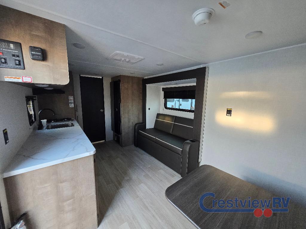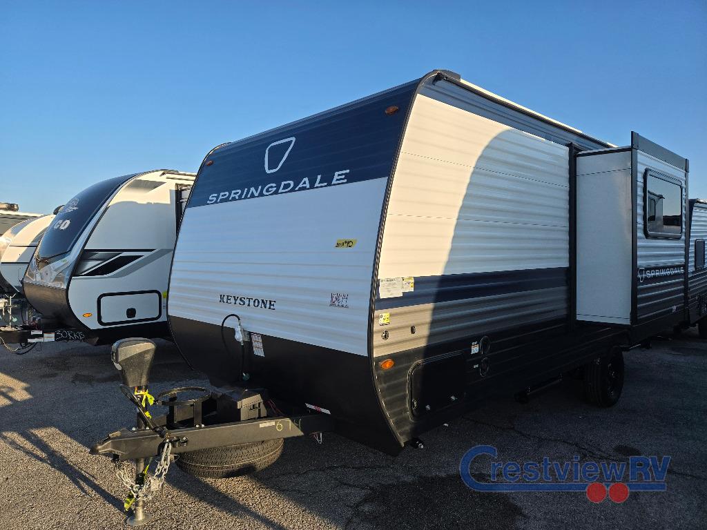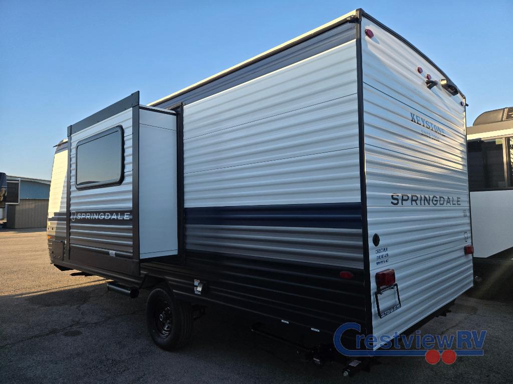 Keystone Springdale Mini travel trailer 1950RBS highlights: Full Rear Bath, Pull-Out Olympic RV Queen Bed, 10 Cu. Ft. Refrigerator, 16' Awning with LED Lights, Kitchen Pantry. Camping trips just got easier with this travel trailer that can sleep three to four each night! You'll enjoy more floor space to move about thanks to the sofa slide out, and the full bath is tucked in the back for added privacy. There is generous counter space in the kitchen, along with a two-burner cooktop and microwave oven to cook meals. Up front, you'll find a picnic table to dine at, plus a Murphy style pull-out Olympic RV queen-size bed, giving you both seating and sleeping space. Dual bedside wardrobes will let you keep your clothes organized, and an exterior pass-through storage will be perfect for fishing poles, camp chairs and more! With any Springdale Mini travel trailer by Keystone, you will enjoy lightweight towing thanks to their single axle! The XL tinted safety glass windows are ultra durable, and the power awning will provide protection from the sun as you relax in your camp chairs outside. Each model includes blackout night shades, LED lighting, plus many more interior comforts. There is also a 20K BTU furnace to keep you comfortable, plus a tankless water heater for endless hot showers!