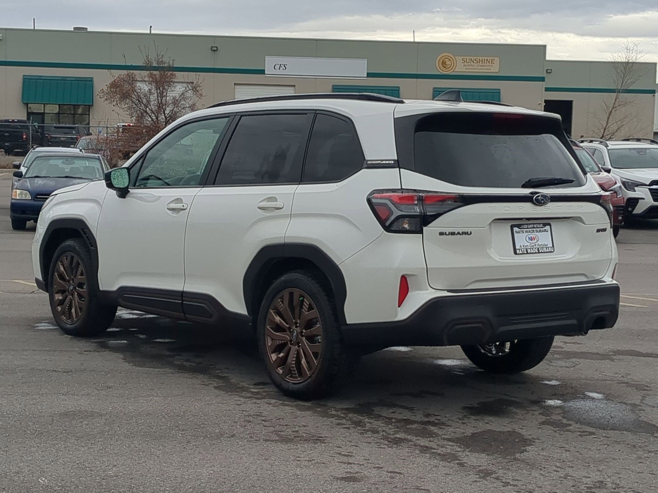 The 2026 Subaru Forester Wilderness in Crystal White Pearl features a 2.5L DOHC 16 Valve 4-Cylinder engine and all-wheel drive. This compact SUV offers a comfortable interior with silver and copper stitching, embossed Subaru Wilderness logo on head restraints, and a panoramic sunroof. The vehicle is equipped with advanced safety features, including EyeSight Adaptive Cruise Control, Blind Spot Monitor, and Lane Departure Warning. The Forester Wilderness is designed for both city driving and off-road adventures, providing a balance of technology, comfort, and capability.