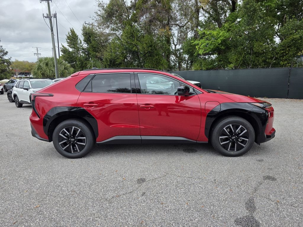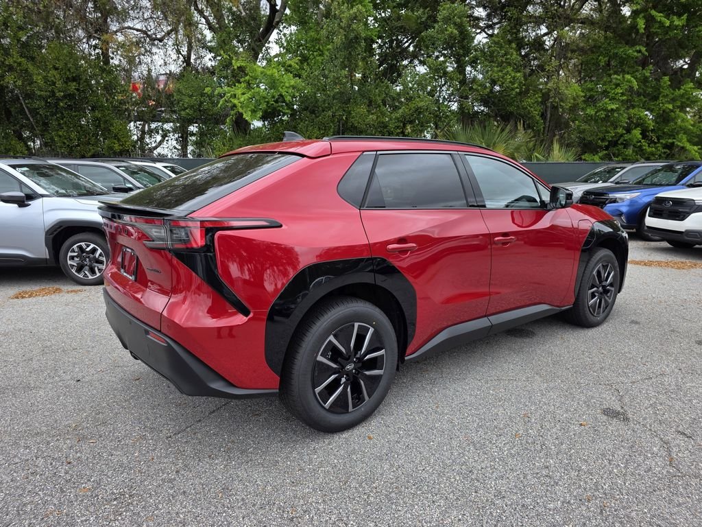 The 2026 Subaru Solterra Premium AWD SUV in Elemental Red Pearl features a front & rear eAxle with an AC synchronous electric motor and a 1-speed automatic transmission. This all-electric vehicle offers a comfortable interior with heated front bucket seats, a leather steering wheel, and StarTex upholstery. The exterior is finished in Elemental Red Pearl and includes LED headlights, a power liftgate, and a range of advanced safety features. The Solterra is designed for efficiency and performance, with an estimated battery range of 288 miles and a host of technology and driver assistance systems.