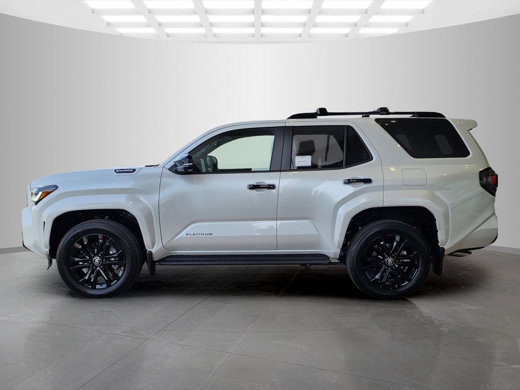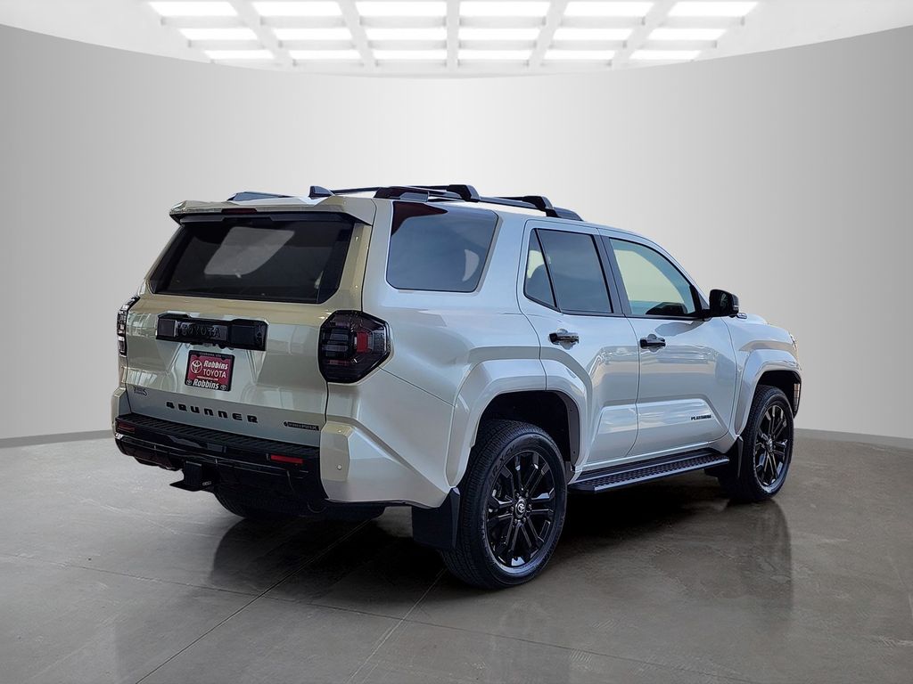 The 2026 Toyota 4Runner Platinum features a Wind Chill Pearl exterior and a Blue interior. It is powered by the i-FORCE MAX 2.4L turbocharged inline 4-cylinder hybrid powertrain, offering 326 hp and 465 lb.-ft. of torque. The vehicle is equipped with a full-time 4-wheel drive system, an 8-speed automatic transmission, and a suite of advanced safety features. The Platinum trim includes premium leather-trimmed heated and ventilated front seats, a power tilt/slide moonroof, and a 14-in. Audio Multimedia Display with a 14-speaker JBL Premium Audio system.