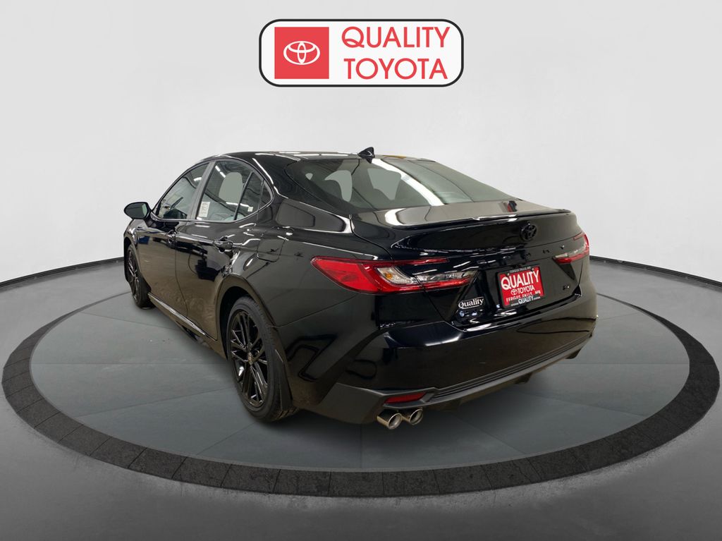 The 2026 Toyota Camry SE in Midnight Black Metallic features a 2.5L 4-Cyl. Gas/Electric Hybrid engine and a front-wheel drive system. This vehicle offers a comfortable interior with black fabric-trimmed seats, dual zone automatic climate control, and an 8-in. Toyota Audio Multimedia touchscreen. Safety features include Toyota Safety Sense 3.0, which includes Pre-Collision System with Pedestrian Detection, Full-Speed Range Dynamic Radar Cruise Control, Lane Departure Alert with Steering Assist, Lane Tracing Assist, Road Sign Assist, Automatic High Beams, and Proactive Driving Assist. The exterior is designed with sport-inspired elements and LED lighting for a dynamic look.