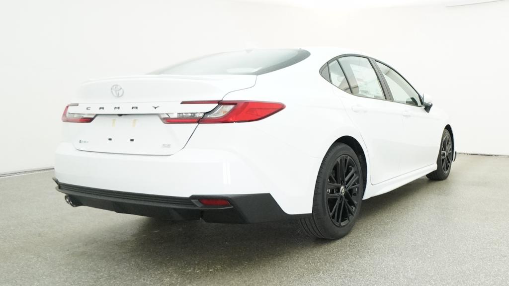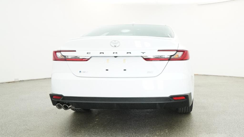 The 2026 Toyota Camry SE features a 2.5L 4-Cyl. Gas/Electric Hybrid engine and a front-wheel drive system. It comes with an electronically controlled Continuously Variable Transmission and a range of advanced safety features. The interior includes a black color scheme, dual zone automatic climate control, and an 8-in. Toyota Audio Multimedia touchscreen with wireless Apple CarPlay and Android Auto compatibility. The exterior is finished in Ice Cap, complemented by 18-in. multi-spoke black-finished alloy wheels and a sport-tuned suspension.