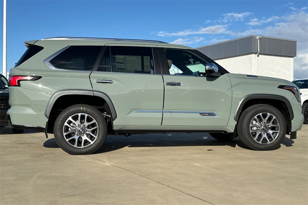 The 2026 Toyota Sequoia 1794 Edition features a Lunar Rock exterior and a Tan interior. Powered by an i-FORCE MAX Hybrid engine, it offers a luxurious driving experience with advanced technology and safety features. The vehicle is equipped with a panoramic roof, massaging front seats, and a premium audio system, making it ideal for families and those who need extra towing capacity.
