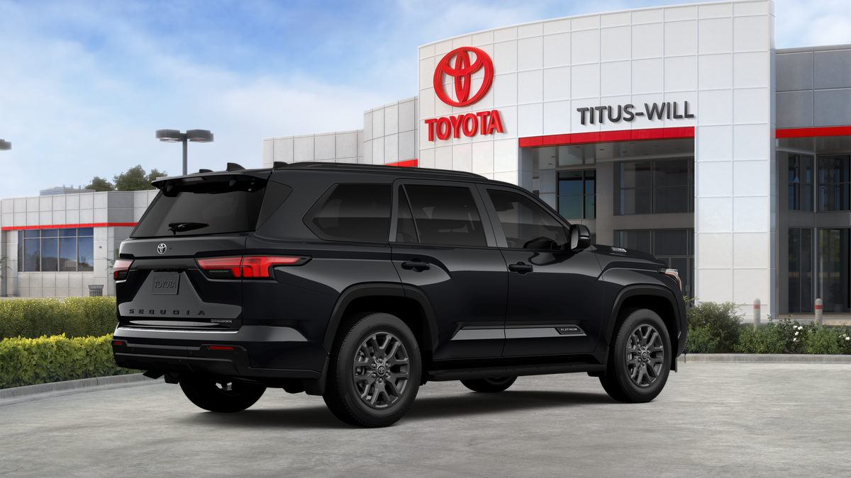 The 2026 Toyota Sequoia Platinum is in stock at Titus-Will Toyota in Tacoma. It features a Midnight Black Metallic exterior and a black interior. The vehicle is equipped with a hybrid i-FORCE MAX engine, 4-Wheel Drive, and a range of premium features for comfort, safety, and performance. Please see the window sticker for more details.