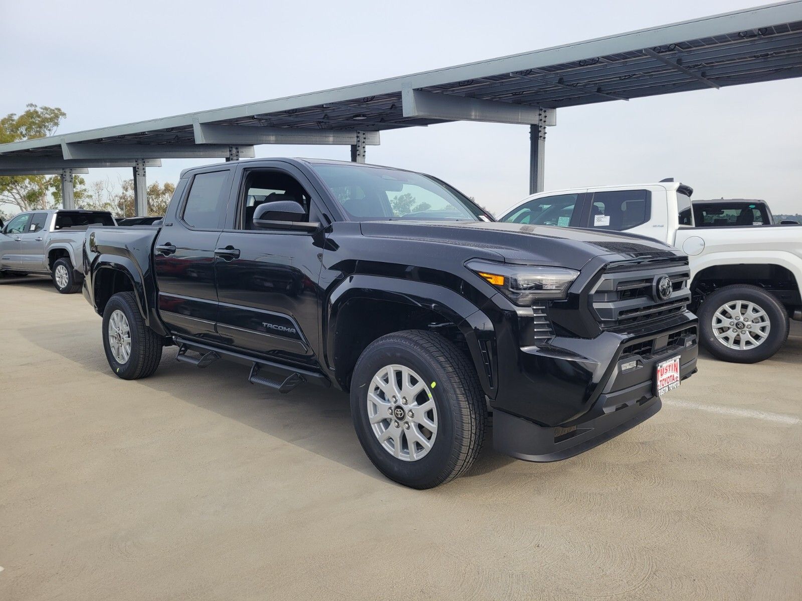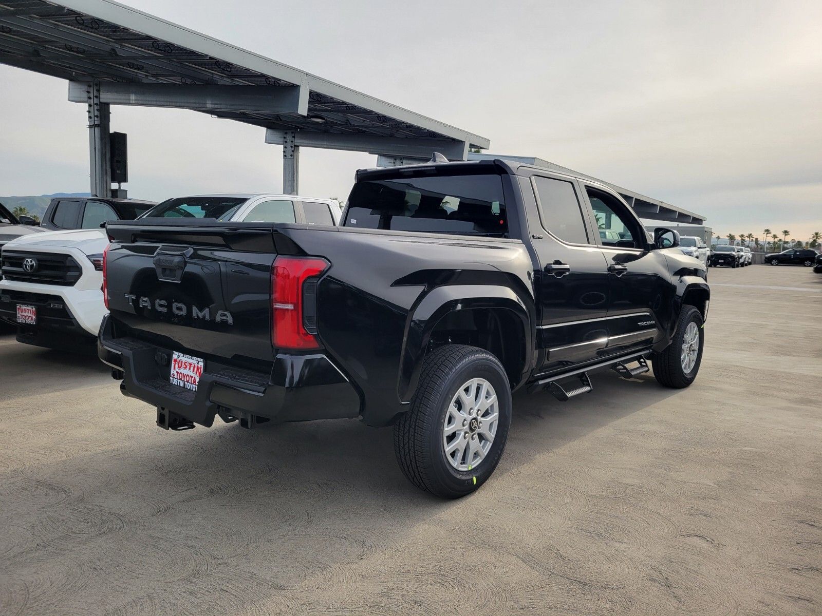 The 2026 Toyota Tacoma SR5 Double Cab Rear-Wheel Drive is in stock at the Tustin, CA dealership. It features an i-FORCE 2.4L 4-Cyl. Turbo Engine, rear-wheel drive, and a bold black exterior with black interior. The truck is equipped with a 8-speed automatic transmission, double cab, and a range of Toyota Safety Sense 3.0 features. This Tacoma is designed for both work and play, offering a comfortable ride and a suite of driver assist technologies.