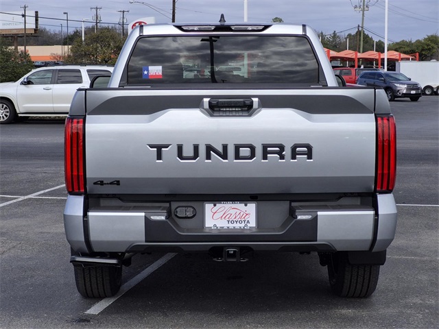 The 2026 Toyota Tundra SR5 CrewMax 4-Wheel Drive features a Celestial Silver Metallic exterior and a black interior. Powered by an i-FORCE V6 Engine, it offers a comfortable and technologically advanced driving experience. The vehicle is equipped with a range of features including automatic climate control, AWD, backup camera, fog lights, and a 10-speed electronically controlled automatic transmission with intelligence and sequential shift mode. Safety and convenience are prioritized with Toyota Safety Sense 2.5, LED headlights, and a power vertical rear window with defogger and privacy glass.