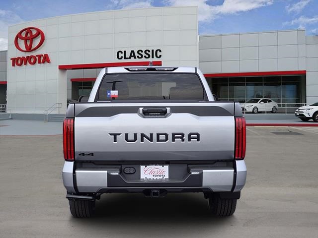 The 2026 Toyota Tundra SR5 CrewMax 4-Wheel Drive features a Celestial Silver Metallic exterior and a black interior. Powered by an i-FORCE V6 Engine, it offers a comfortable and technologically advanced driving experience. The vehicle is equipped with a range of features including automatic climate control, AWD, backup camera, fog lights, and a 10-speed electronically controlled automatic transmission with intelligence and sequential shift mode. Safety and convenience are prioritized with Toyota Safety Sense 2.5, LED headlights, and a power vertical rear window with defogger and privacy glass.