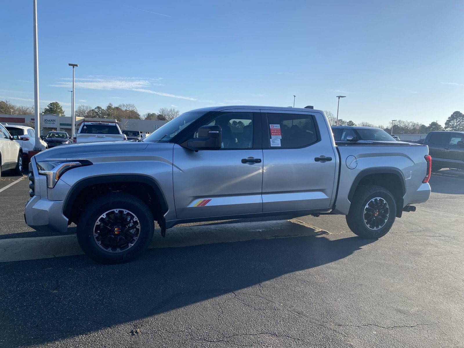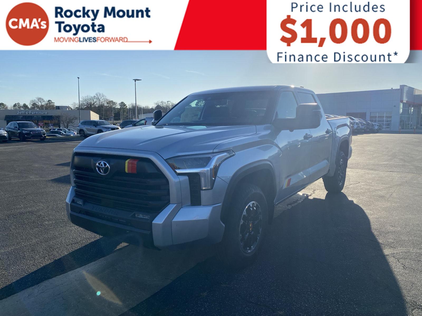 Thank you for choosing CMA's Rocky Mount Toyota, this Celestial Silver Metallic 2026 Toyota Tundra SR5 is a great choice! City 17/HWY 22. Celestial Silver Metallic, Black, premium leather seat trim. TRD Off-Road Package ($2,180 value). All prices include $1,000 dealer finance discount applied. All other discounts taken off of dealer added accessories before T, T, L, and doc fee. Must finance all New Toyota's through SETF with dealer or the discount will be added back to the overall price. Outside liens and cash deals do not qualify. All vehicles are sold on a first come first serve basis due to multiple people interested in the same vehicles without prior knowledge. Pricing Info Good Today Through Close of Business. Pricing excludes dealer added accessories. Premium Safety Package before finance discount is a minimum of $1,999.00.