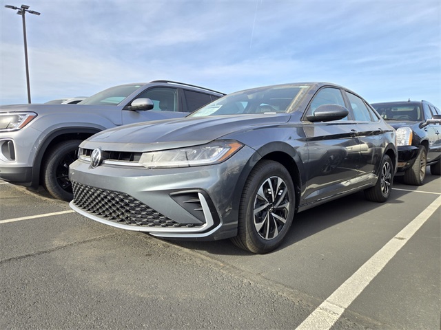 Platinum Gray 2026 Volkswagen Jetta 1.5T S FWD 8-Speed Automatic with Tiptronic 1.5L I-4 DI DOHC Turbocharged Titan Black Cloth, 4 Speakers, 4-Wheel Disc Brakes, ABS brakes, Active Blind Spot Monitor, Air Conditioning, Auto-dimming Rear-View mirror, Automatic temperature control, Brake assist, Bumpers: body-color, Cloth Seat Trim, Custom 20" Black Wheels, Delay-off headlights, Driver door bin, Driver vanity mirror, Dual front impact airbags, Dual front side impact airbags, Electronic Stability Control, Emergency communication system: VW Car-Net Safe & Secure 5-year, Exterior Parking Camera Rear, Front anti-roll bar, Front Bucket Seats of manually adjustable driver and passenger. Recent Arrival! 29/40 City/Highway MPG.