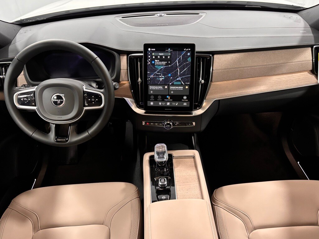 The 2026 Volvo XC90 B6 Plus 7-Seater is a luxury SUV in transit to Leikin Volvo Cars Cleveland. This new model features a comfortable and climate-controlled interior with a four-zone climate system, heated steering wheel, and third row air conditioning. The exterior is finished in Crystal White with a bright aluminum trim and 21-inch wheels. The vehicle is equipped with advanced safety and driver assistance technologies, including a 360° camera, adaptive cruise control, and a panoramic roof. The interior features genuine wood decor, quilted Nordico upholstery, and a luxurious ambient lighting system. This XC90 is designed for both comfort and performance, offering a smooth ride and intuitive automatic transmission.