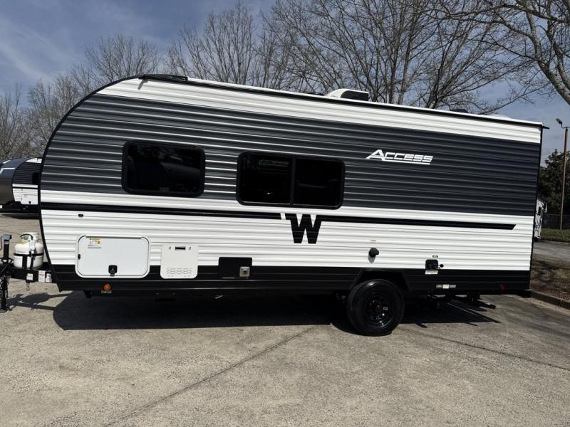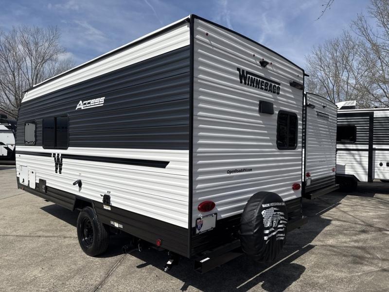 Winnebago Access travel trailer 18RK highlights: Rear Corner Bath, Flip-Out Sofa, Front Queen Bed, Pass-Through Storage. Enjoy generations of fun in this travel trailer! The front 60" x 80" queen bed offers a comfortable place to lay your head at night and a shirt closet to hang your clothes. You can even transform the 64" flip-out sofa and 38" x 68" booth dinette into extra sleeping space. The rear corner kitchen has everything you need to prepare a delicious home cooked meal and a 12V refrigerator to store any leftovers. After a fun-filled day, head to the rear corner bathroom to freshen up in the 30" x 36" shower with a skylight to let in some natural lighting! With any Winnebago Access travel trailer you will find thoughtful, clean, and contemporary designs filled with premium features that all have come to expect on any Winnebago towable. There are single and tandem axle models available, each with superior storage, durable construction, and spacious interiors. Each model features an NXG engineered frame, a one-piece TPO roof membrane, and durable sidewall metal, providing a long-lasting RV. The functional galley kitchen will make time at the campground easier than ever, and the stylish roller shades will provide privacy and shade when you need it!