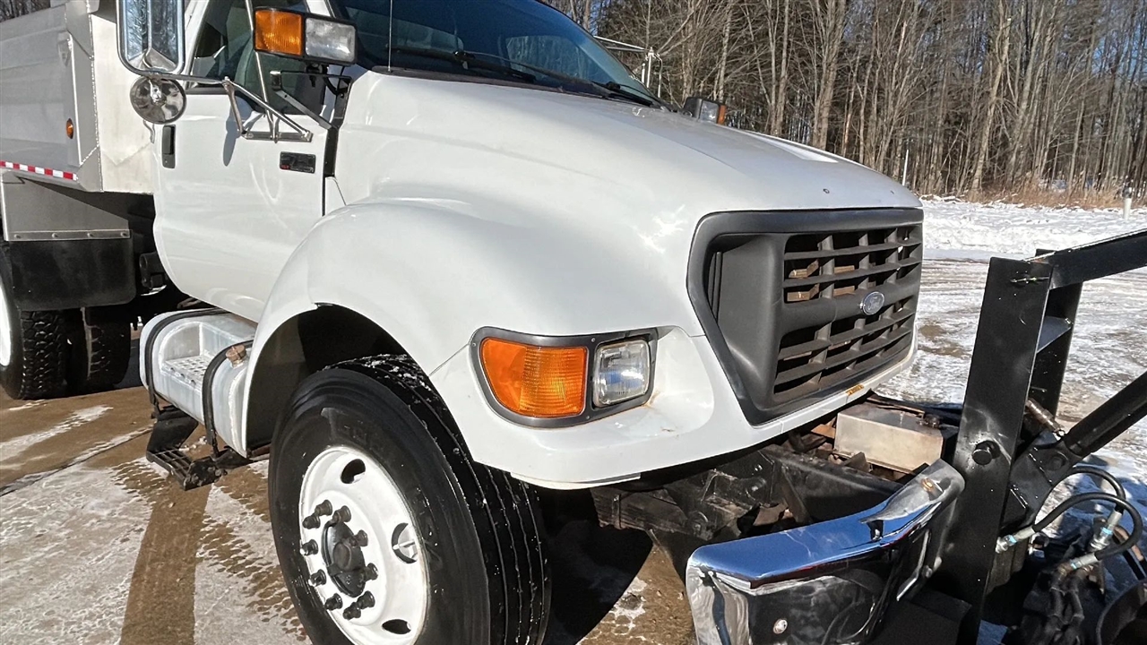 Clean F750 with Caterpillar engine and only 59k Miles! 2000 Ford F750, Cat 3126 inline 6 turbo-diesel engine, 7-speed manual transmission. This truck has been extensively gone through including, new brake drums, and chambers, new starter, oil change, fuel filters, new batteries, and full detail. In addition to the truck mechanicals, we had the entire hydraulic system serviced including the replacement of hoses, fittings, and fluid. The salt spreader unit was also serviced with new controller valves, new spinner and auger motors, and new auger bearing. ABS light is currently on, codes fro front sensors. We ordered 2 front sensors as those appear to be damaged. We will install the new sensors but can not guarantee the ABS light will resolve. This truck runs and drives well and incredibly clean for a truck this age. Financing and warranties available, trade-ins welcome!