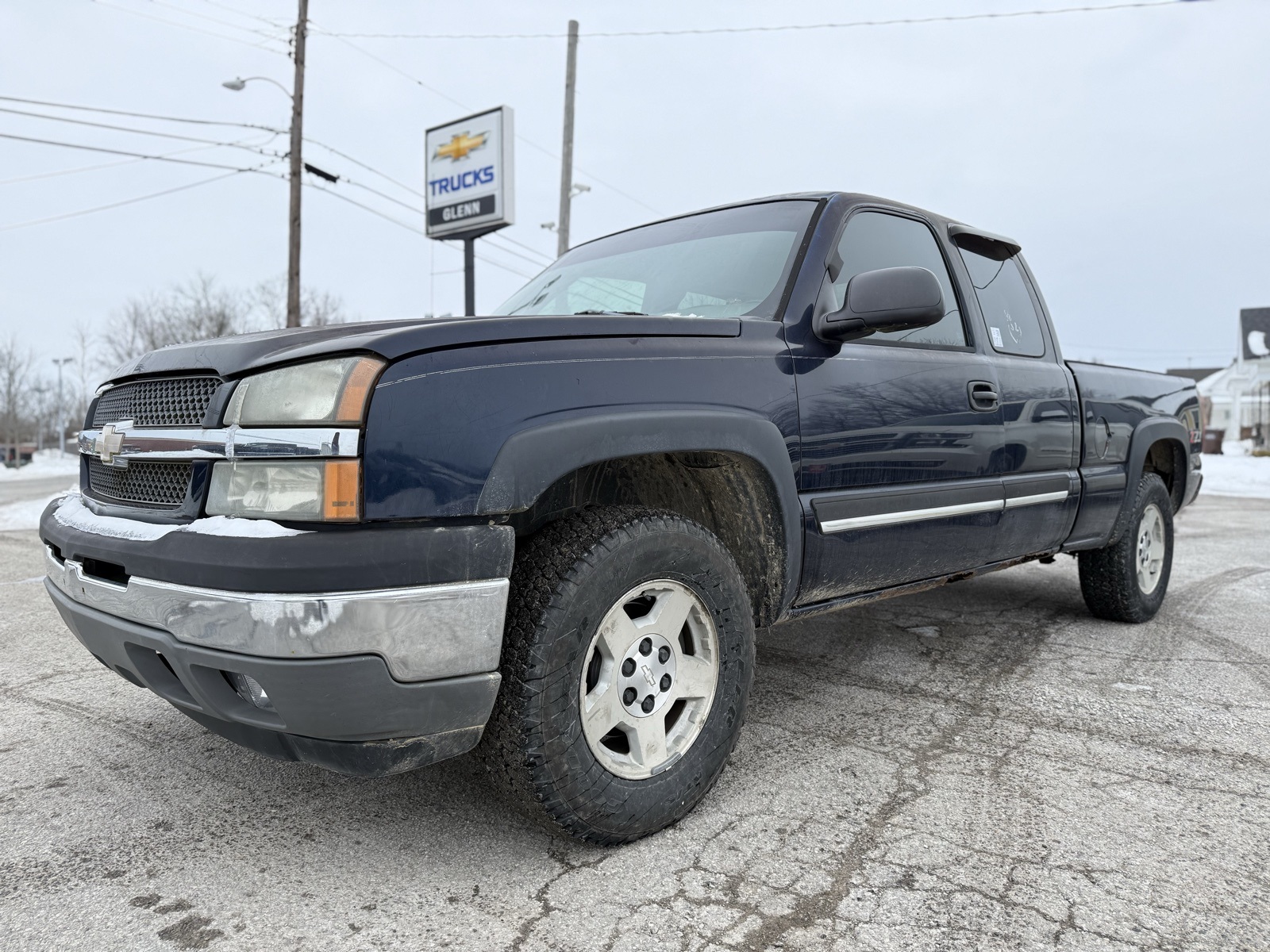 This 2005 Chevrolet Silverado 1500 Z71 Extended Cab 4x4 is finished in Dark Blue Metallic over Dark Charcoal cloth with a split-bench front seat. Power comes from a 5.3L V8 paired with a 4-speed automatic transmission and a 3.42 rear axle. The Light Duty Power Package and Z71 Off-Road Package add a locking/limited-slip differential, off-road suspension, skid plates, and an Autotrac electronic transfer case for improved traction. Exterior highlights include aluminum wheels, fog lamps, heated power mirrors, tow hooks, and a factory tow hitch. Inside, you get power windows and locks, keyless entry, cruise control, multi-zone air conditioning, and an AM/FM cassette/CD audio system with a premium sound system. Safety equipment includes daytime running lights, anti-lock brakes, automatic headlights, and dual front airbags.