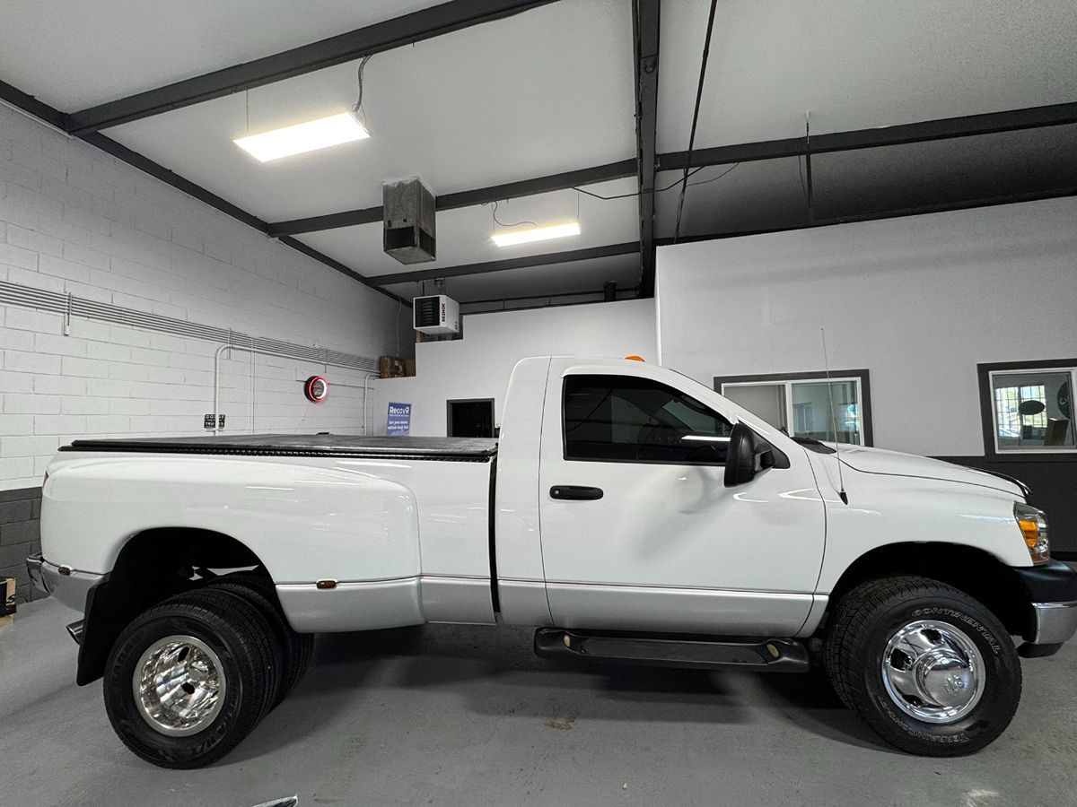 Meet our hard to find 2006 Dodge RAM 3500 ST Regular Cab Dually 4X4 in Bright White! Underneath the hood lies a powerful 5.9 Liter Turbo Cummins Diesel that delivers 325hp while connected to an Automatic transmission. This Four Drive truck is a stump puller while offering exceptional economy on the road. You will also love the installed running boards and tonneau cover! It's as quiet as can be inside the cab and this truck takes you down the highway in smooth comfort. Our ST Regular Cab is straightforward with a user-friendly design that delivers just the right amount of comfort features you will appreciate. Our RAM is a hard-core truck that makes a dramatic impression. Trucks like this make a statement! Save this Page and Call for Availability. We Know You Will Enjoy Your Test Drive Towards Ownership!