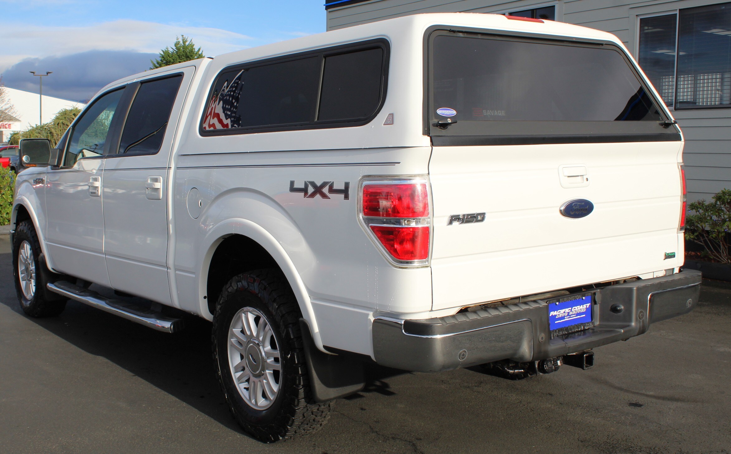 2010 Ford F-150 Lariat 4x4 5.4L V8 SuperCrew Cab. White exterior with black leather interior. Keyless entry, cruise control, memory driver's seat, AM/FM/XM, CD, AUX, dual climate control, dual heated/AC seats, garage opener, power rear sliding window, running boards, bed cap, tow package, rear parking sensors, lined truck bed, and bed step. Pacific Coast Auto Center is a top-rated used car dealership in Burlington proudly serving the entire Northwest and surrounding cities for over 27 years.