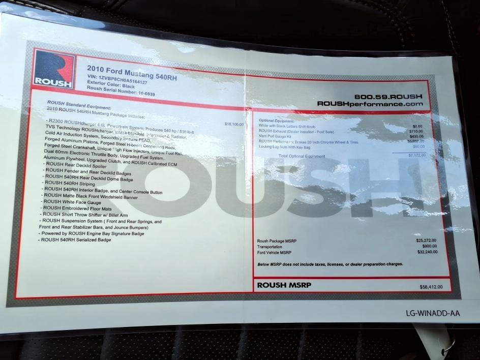 The 2010 Ford Mustang ROUSH 540RH comes equipped with an impressive combination of performance-focused options and premium features, including a rapid spec 400A package, California emissions system, and a 3.55 ratio limited slip axle for enhanced traction and driving dynamics, along with a rear spoiler delete and front license plate bracket. On the exterior, it features auto headlamps, front fog lamps, stainless steel dual exhaust, variable interval wipers, a rear window defroster, rear decklid spoiler, and distinctive LED sequential taillamps for a bold presence. Inside, it offers a sporty and comfortable cabin with leather-trim sport seats, a power 6-way driver’s seat, manual 2-way front passenger seat, a center console with armrest, air conditioning, ambient lighting, and a leather-wrapped steering wheel. Technology includes a Shaker 500 audio system with AM/FM in-dash 6CD/MP3 capability and AUX input, along with SYNC voice-activated system, making the 2010 Ford Mustang ROUSH 540RH a powerful and well-equipped performance coupe.