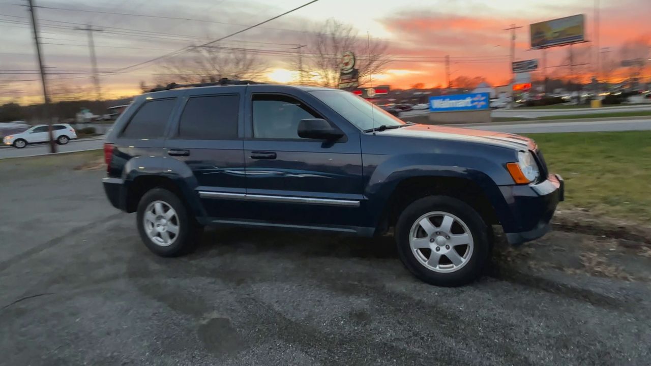 This pre-owned 2010 Jeep Grand Cherokee Laredo offers Four Wheel Drive and a V6 engine. The vehicle is in Blue and features a full size spare tire, roof rack side rails, and aluminum sparkle silver wheels. It is equipped with advanced safety features and a comfortable interior. The Grand Cherokee is a 4WD Sport Utility Vehicle with a passenger capacity of 5.