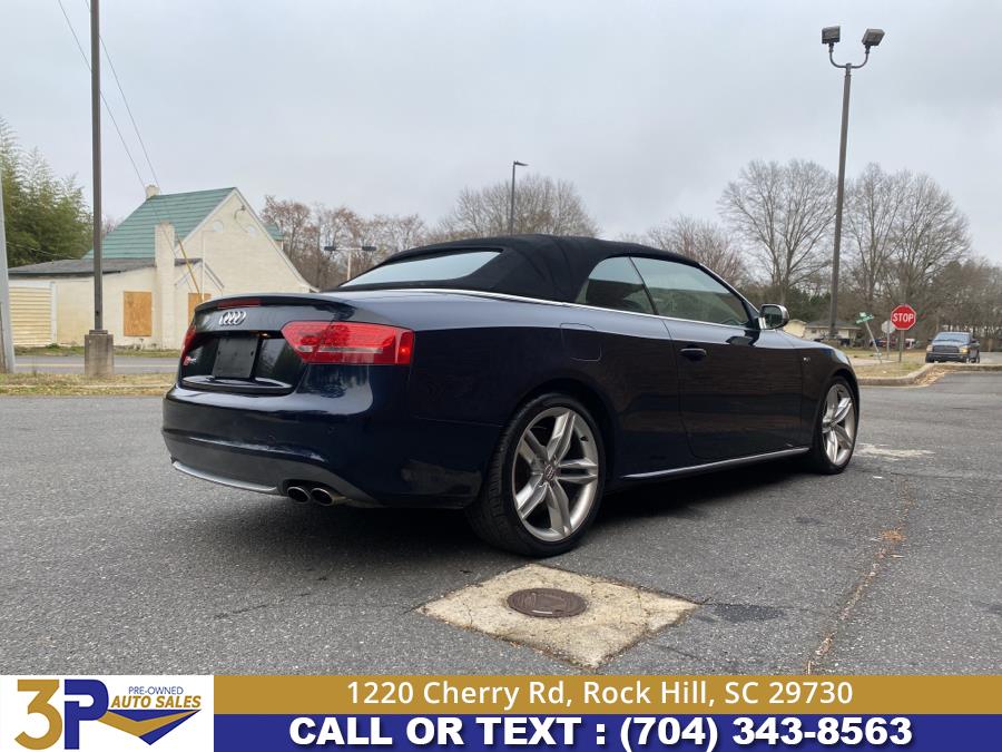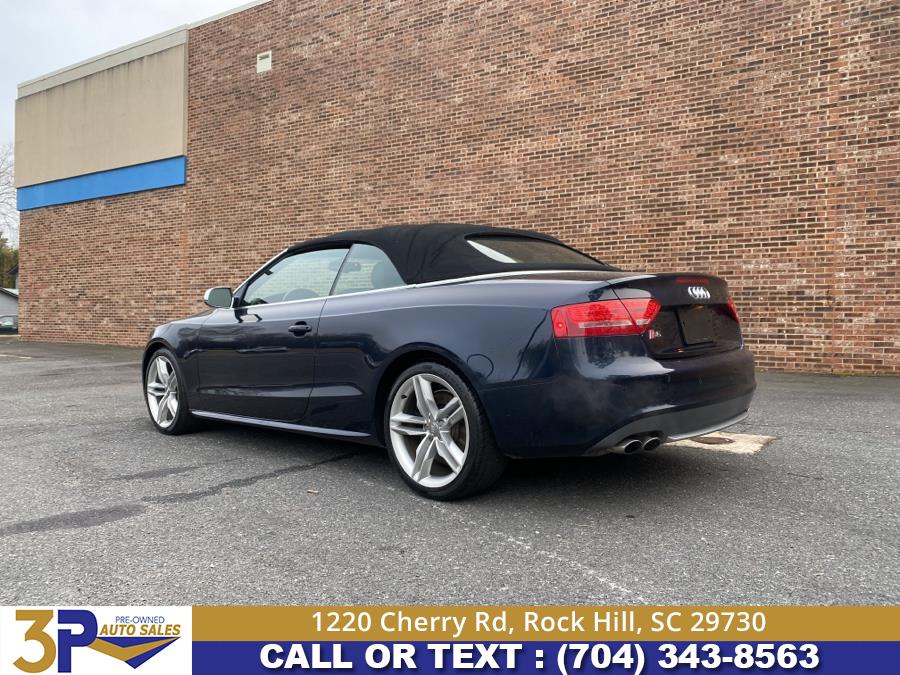 Great Price Will not last! 2011 Audi S5 2dr Cabriolet Prestige, available for sale in Rock Hill, South Carolina. Deep Sea Blue Pearl exterior with Black leather interior. All wheel drive. This vehicle features a 3.0L DOHC TFSI supercharged V6 engine and a 7-speed S tronic automatic dual-clutch transmission. The mileage is 134,387 miles. The vehicle is in stock and available at 3 Points Auto Sales in Rock Hill, SC.