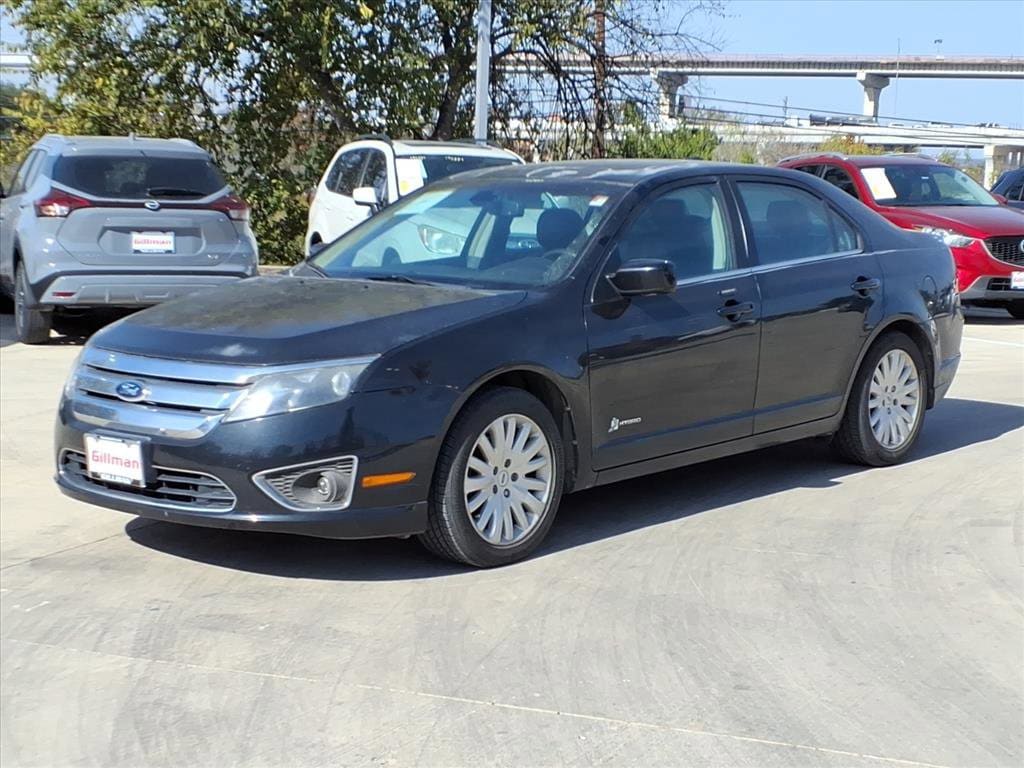Gillman's Lifetime Engine Warranty lasts as long as you own your vehicle - free with the Gillman Pre-Owned Promise. If the vehicle isn't right for you, return it in purchase condition within 2 days or 200 miles as part of our Happy-Driving Guarantee. (Valid on vehicles under 90,000 miles and less than 7 years old). Experience efficiency and style with this Black 2012 Ford Fusion Hybrid 4dr Sedan. Equipped with a fuel-saving 2.5L Hybrid I4 engine and smooth CVT transmission, this sedan offers an impressive blend of power and fuel economy. Enjoy premium comfort with leather-trimmed seats, heated front row, and dual-zone automatic climate control. Stay connected with SYNC infotainment, voice-activated navigation, and SiriusXM Satellite Radio. Safety is a priority thanks to rear parking sensors, a tire pressure monitoring system, stability and traction control, and a perimeter alarm anti-theft system. Additional features include a power-adjustable driver's seat with lumbar support, aluminum alloy wheels, keyless entry, and a convenient trunk release. With its sleek design, advanced technology, and hybrid efficiency, this Fusion Hybrid is the perfect choice for drivers seeking value and reliability.