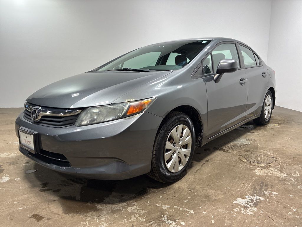 2012 Honda Civic LX Gray 1.8L I4 SOHC 16V i-VTEC FWD. Cloth. Price does not include Patriot Package, Dealer Installed Accessories, Dealer Documentation Fee, or State/Local Taxes additional fees. Price, discount & savings, and availability intended for in state or local servicing customer with a qualified retail trade and financing arranged by dealer through a lender of their choosing at standard market rates. Price and availability subject to change without notice. See Dealer for Details.
