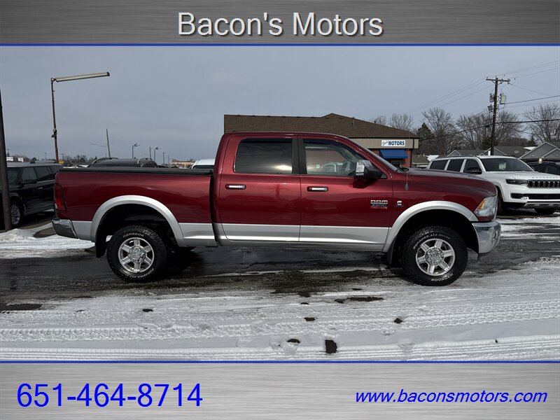 2012 Ram 2500 Laramie — Deep Molten Red Pearl Coat/Bright Silver Metallic Clear Coat exterior with Dark Slate Gray leather interior. Powered by the Cummins 6.7L Turbo Diesel I6 delivering 350 hp and 650 lb-ft of torque, this one-owner truck has excellent overall condition and well-maintained, low mileage (under 99,000 miles — averaging less than 7,000 miles per year). Asking price is listed below J.D. Power Book value. Clean CARFAX. This 2012 Ram 2500 Laramie pairs a proven Cummins diesel powerplant with Laramie-level comfort and useful cold-weather options. The combination of low ownership count, clean history, and pricing below J.D. Power Book value makes it a strong option for buyers seeking a capable, well-maintained heavy-duty pickup. Contact to confirm availability or request additional photos and vehicle history details.