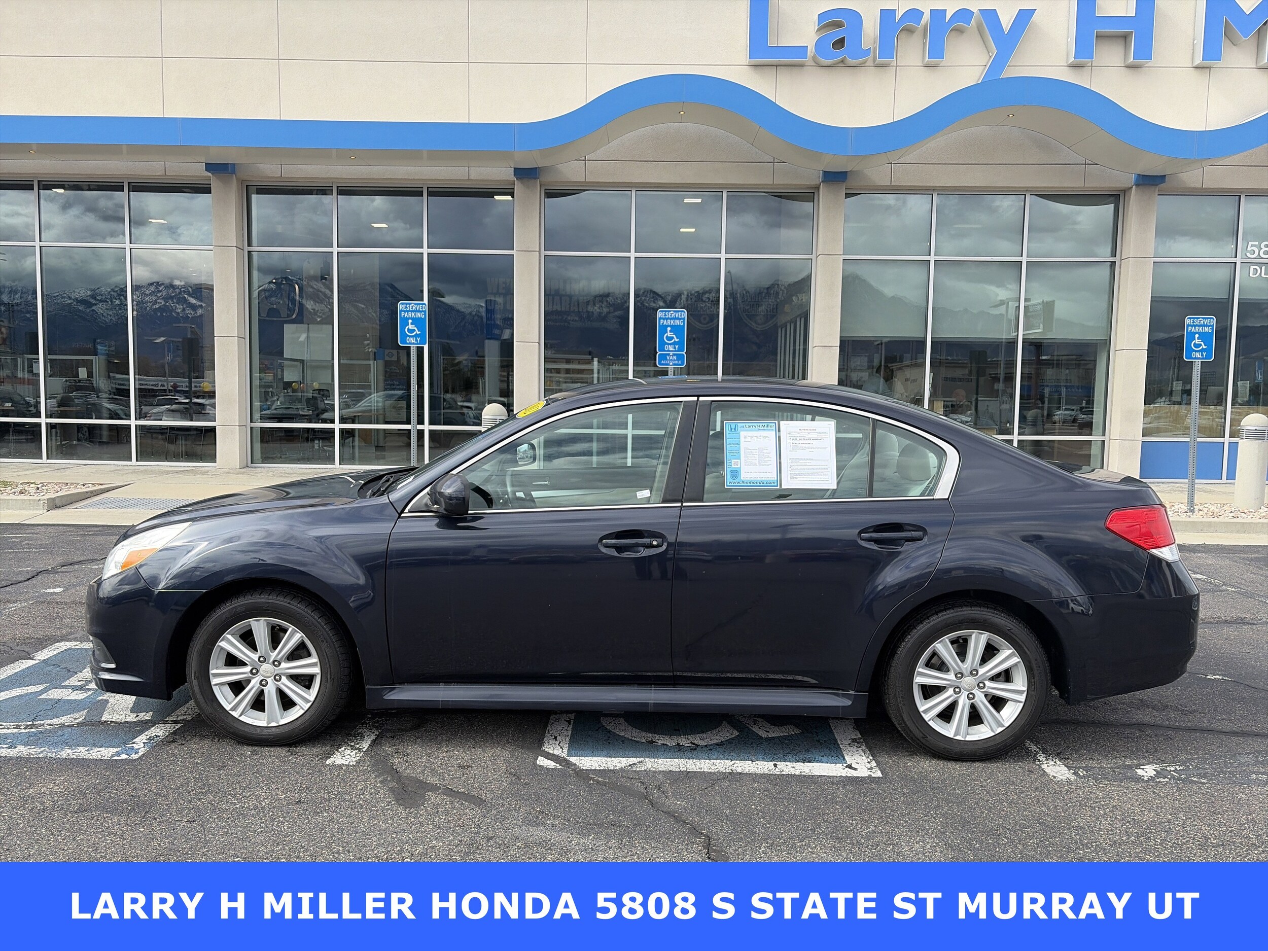 Odometer is 44548 miles below market average! Larry H. Miller Honda Murray offers this 2012 Deep Indigo Pearl Subaru Legacy 2.5i AWD. It is loaded with many standard and optional features including: All-Weather Package (Heated Exterior Mirrors, Heated Front Seats, and Windshield Wiper De-Icer), 16 x 6.5 Aluminum Alloy w/Silver Finish Wheels, 4-Wheel Disc Brakes, 6 Speakers, ABS brakes, Air Conditioning, Alloy wheels, AM/FM radio, AM/FM Stereo w/Single-Disc CD Player, Anti-whiplash front head restraints, Brake assist, Bumpers: body-color, CD player, Cloth Upholstery, Driver door bin, Driver vanity mirror, Dual front impact airbags, Dual front side impact airbags, Electronic Stability Control, Four wheel independent suspension, Front anti-roll bar, Front Bucket Seats, Front Center Armrest w/Storage, Front reading lights, Fully automatic headlights, harman/kardon Audio System, Illuminated entry, Low tire pressure warning, Occupant sensing airbag, Outside temperature display, Overhead airbag, Overhead console, Panic alarm, Passenger door bin, Passenger vanity mirror, Power door mirrors, Power driver seat, Power steering, Power windows, Radio data system, Rear anti-roll bar, Rear seat center armrest, Rear window defroster, Remote keyless entry, Security system, Speed control, Speed-sensing steering, Split folding rear seat, Steering wheel mounted audio controls, Steering-Wheel Paddle-Shift Control Switches, Tachometer, Telescoping steering wheel, Tilt steering wheel.