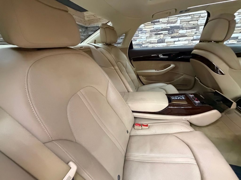 Recent Arrival! 2013 Audi A8 L 3.0T quattro Phantom Black Pearl This A8 L 3.0T is nicely equipped with Camera Assistance Package, Cold Weather Package (Heated 4-Spoke Steering Wheel w/Shift Paddles, Heated Rear Seats, and Rear Seat Pass-Through w/Ski Bag), Comfort Package (22-Way Multi-Contour Comfort Seat), Beige Leather, 14 Speakers, 18-Way Power Heated Front Seats w/Memory, 4-Wheel Disc Brakes, 9.0J x 19" 10-Y-Spoke Design Wheels, 9.0J x 20" 10-Parallel-Spoke Design Wheels, ABS brakes, Adaptive suspension, Air Conditioning, Alloy wheels, AM/FM radio, Anti-whiplash front head restraints, Audi Guard All-Weather Floor Mats, Auto tilt-away steering wheel, Auto-dimming door mirrors, Auto-dimming Rear-View mirror, Auto-leveling suspension, Automatic temperature control, Brake assist, Bumpers: body-color, CD player, Compass, Delay-off headlights, Door auto-latch, Driver door bin, Driver vanity mirror, Dual front impact airbags, Dual front side impact airbags, Dual Pane Acoustic & Break-Resistant Glass, DVD-Audio, Electronic Stability Control, Exterior Parking Camera Rear, Four wheel independent suspension, Front anti-roll bar, Front Bucket Seats, Front dual zone A/C, Front fog lights, Front Grille Filler Panel, Front reading lights, Full LED Headlights, Garage door transmitter: HomeLink, Genuine wood console insert, Head restraints memory, Headlight cleaning, Heated door mirrors, Heated front seats, High intensity discharge headlights: Xenon plus, HVAC memory, Illuminated entry, Knee airbag, Leather Shift Knob, Leather steering wheel, Low tire pressure warning, Memory seat, Navigation System, Occupant sensing airbag, Outside temperature display, Overhead airbag, Overhead console, Panic alarm, Panorama Sunroof, Passenger door bin, Passenger vanity mirror, Power adjustable front head restraints, Power door mirrors, Power driver seat, Power moonroof, Power passenger seat, Power steering, Power windows, Radio data system, Radio: Audi MMI Navigation Plus System, Rain sensing wipers, Rear air conditioning, Rear anti-roll bar, Rear dual zone A/C, Rear fog lights, Rear reading lights, Rear seat center armrest, Rear side impact airbag, Rear Window Blind, Rear window defroster.