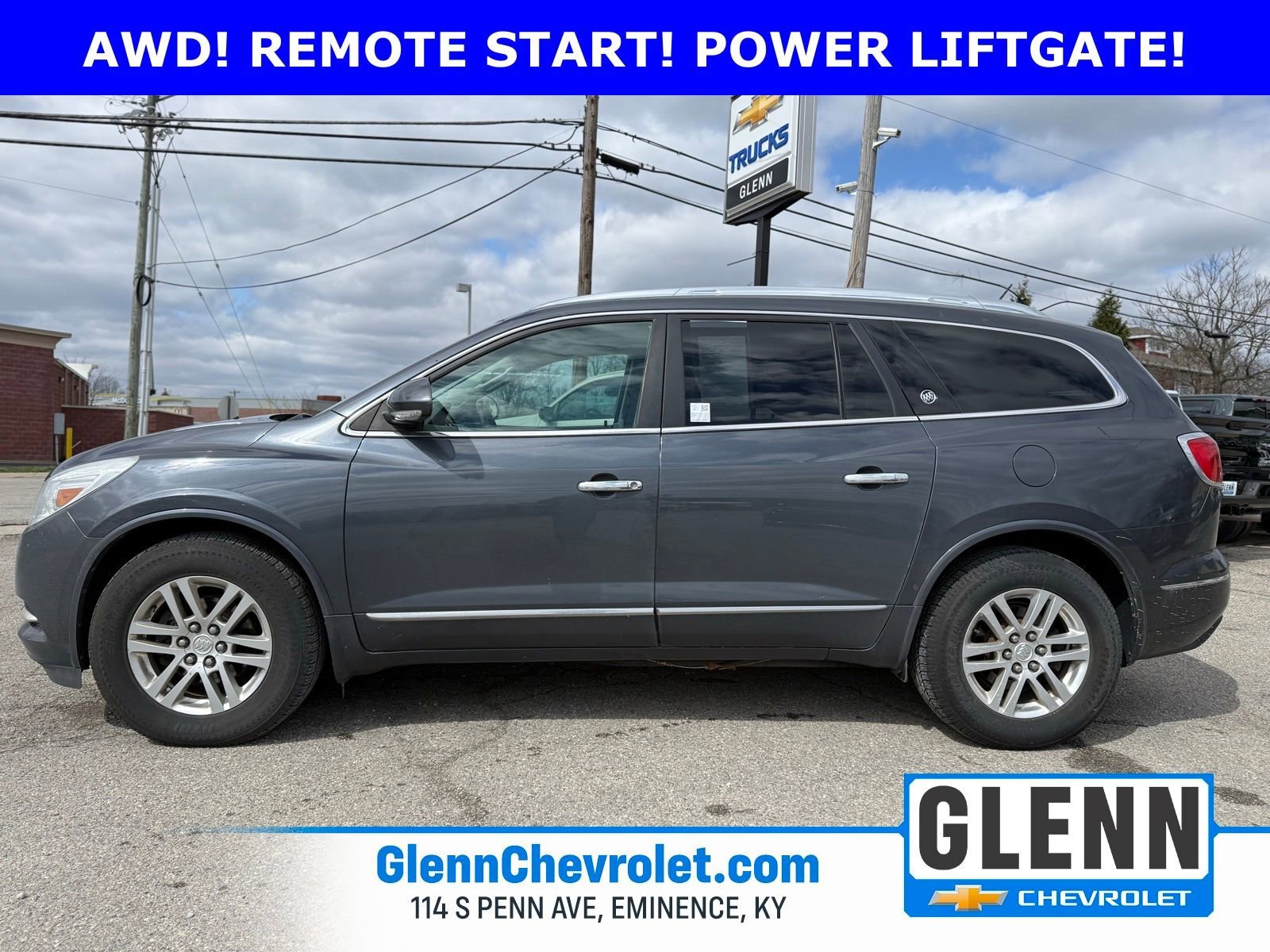 This 2013 Buick Enclave Convenience is finished in Cyber Gray Metallic and powered by a 3.6L V6 paired with a 6 speed automatic transmission and All Wheel Drive. This three row SUV offers a strong mix of family utility, comfort, and upscale Buick features, with seating configured with second row captain’s chairs and a third row. Inside, it comes equipped with cloth seating, a leather wrapped steering wheel, power front seats, remote start, tri zone climate control with rear air conditioning, keyless entry, and a power liftgate. Technology highlights include Bluetooth, satellite radio, MP3 capability, navigation from telematics, smart device integration, a universal garage door opener, and rear parking aid. Buick’s 2013 Enclave brochure also describes the IntelliLink system as using a high resolution touch screen and notes a USB port for connecting an iPhone or digital music player, so those infotainment items are checked here as well. This Enclave is a practical and comfortable AWD SUV with strong passenger space, premium convenience features, and solid everyday usability.
