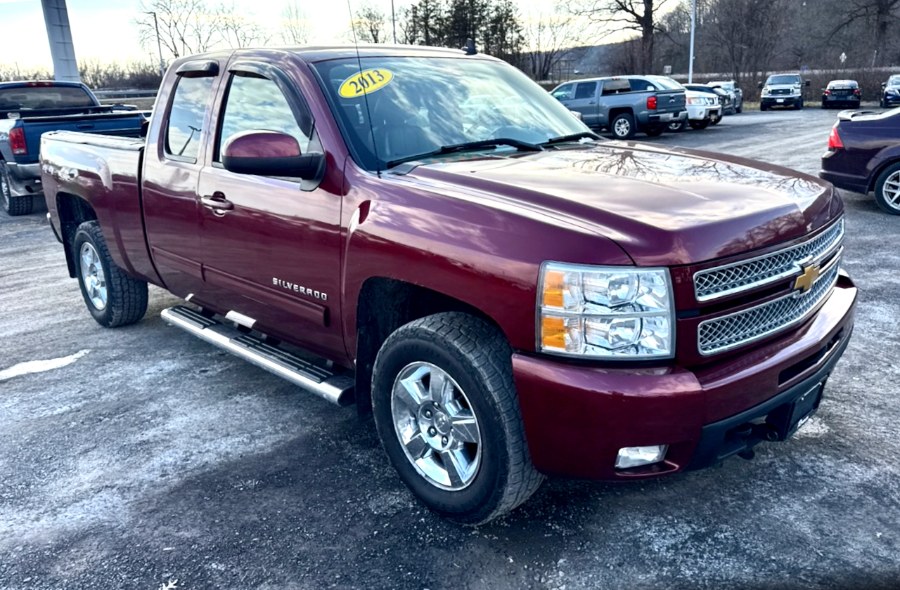 This 2013 Chevrolet Silverado 1500 LTZ 4WD Ext Cab is available for sale in Manchester, New Hampshire. It features a Vortec 5.3L V8 engine, a 6.6 FT bed with heavy-duty trailering equipment, and a premium Ebony Black Leather-appointed interior with heated front bucket seats and driver memory settings. The vehicle is equipped with advanced utility features, a touchscreen audio system with navigation, and a Bose Premium Speaker System. Financing and warranties are available.
